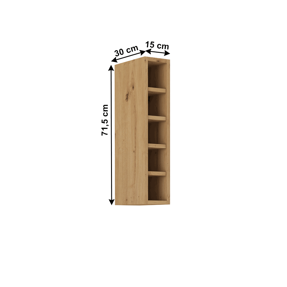 Materiál: laminovaná DTDFarba: dub artisanRozmery (ŠxHxV): 15x30x71,5 cmHrúbka materiálu: 1,6 cmOtvorenáSo 4 policamiModerný dynamický dizajnDodávané v demontePracovnú dosku dub artisan s hrúbkou 3,8cm je možné doobjednať za cenu 65 EURMožnosť dokúpiť univerzálny drez LAY ON.