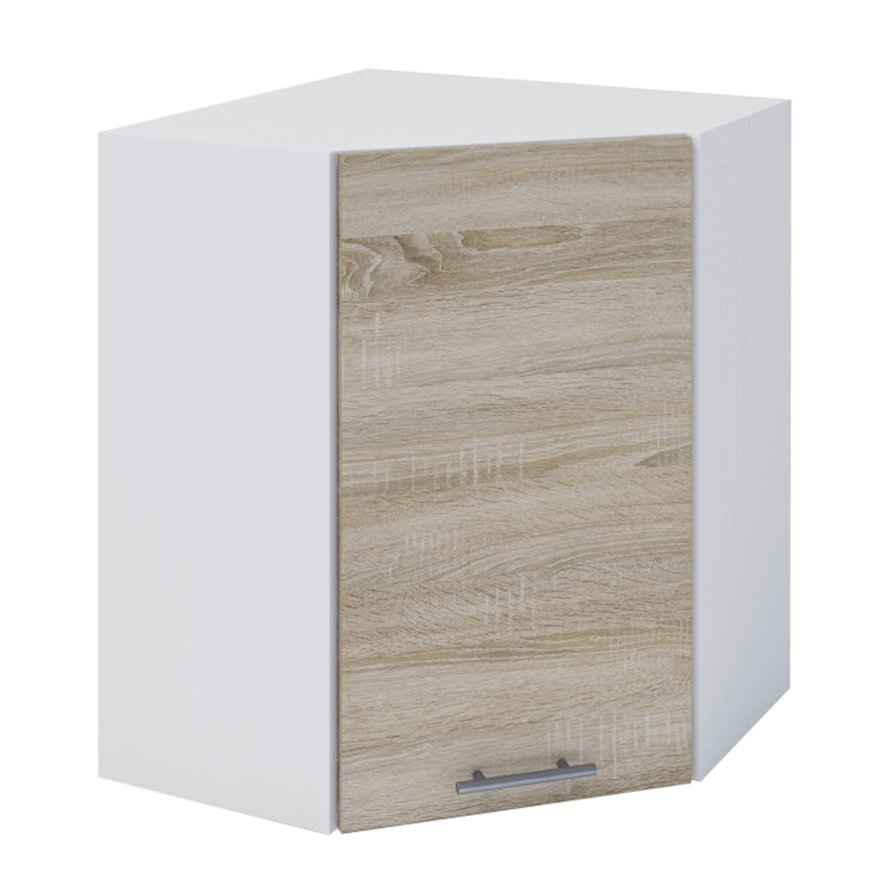 Horná rohová skrinka W60N,Materiál: DTD laminová,Farebné prevedenie: dub sonoma/biela, korpus: biela, dvierka: dub sonoma. Rozmery ŠxVxH: 60x72x60 cm. Šírka bočných strán: 28,5 cmHrúbka materiálu: 16 mm Dodávané v demonte.Skrinky majú štandardtne predvŕtané pánty na pravej strane, montážny návod môže byť len ilustračný.Skrinky základnej zostavy sú dodávané vrátane pracovnej dosky, drezová skrinka je dodávaná bez pracovnej dosky. Sektorové skrinky sú dodávané bez pracovnej dosky.Cena pracovnej dosky je: 1bm: 49 eurMožnosť dokúpenia univerzálneho Ľ/P drezu LAY ON.