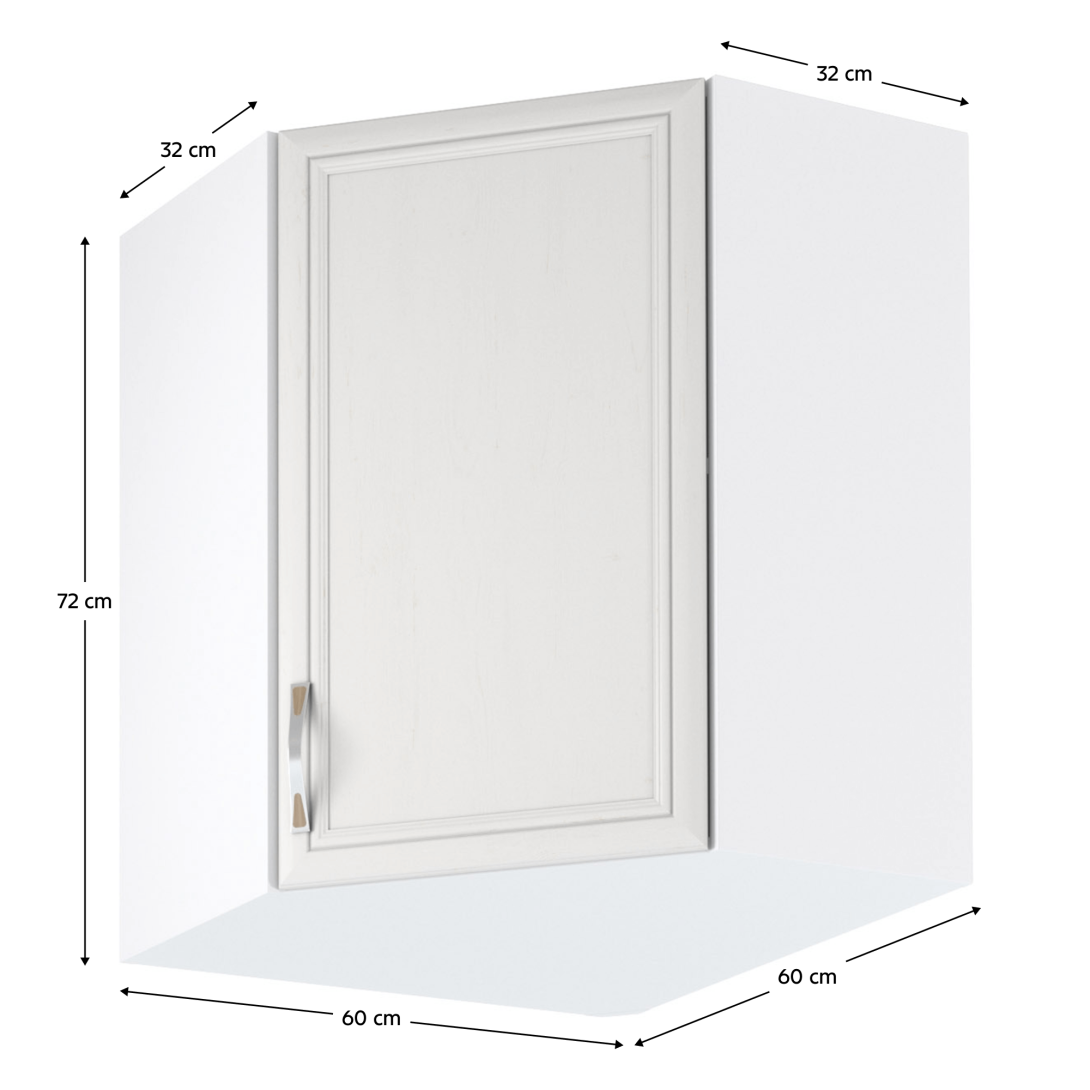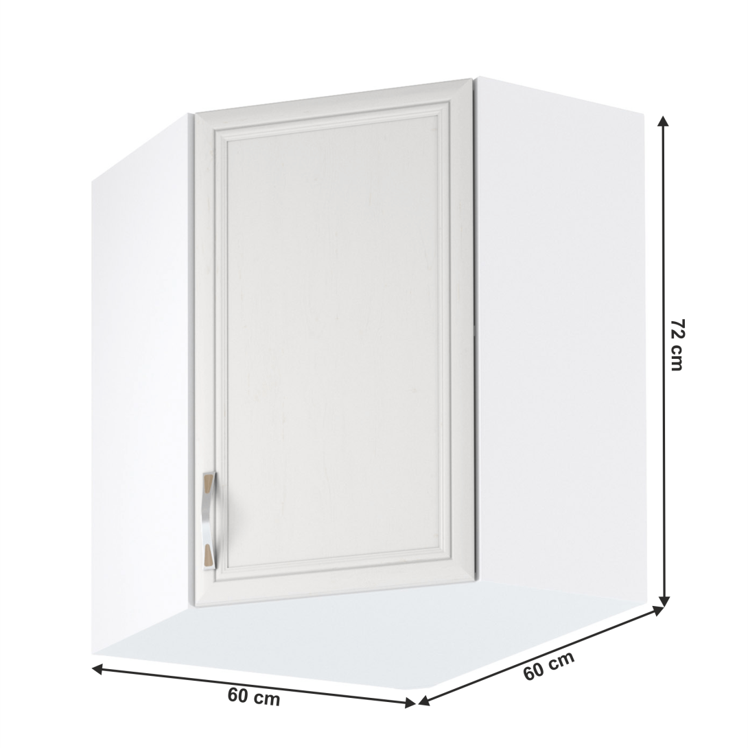 Horná rohová skrinka G60N ku kuchyni SICILIAPrevedenie: DTD laminovaná/MDF lištyFarba: biela/sosna AndersenRozmery (ŠxHxV): 60x60x72 cmHrúbka materiálu: 15 mmSpodné skrinky ku kuchyni SICILIA sú dodávané bez pracovnej dosky. Môžete si objednať pracovnú dosku vo farebnom prevedení dub pieskovec v hrúbke 2,8 cm za 49 eur/bm a pracovnú dosku vo farebnom prevedení dub Lancelot v hrúbke 3,8 cm za 56 eur/bm.