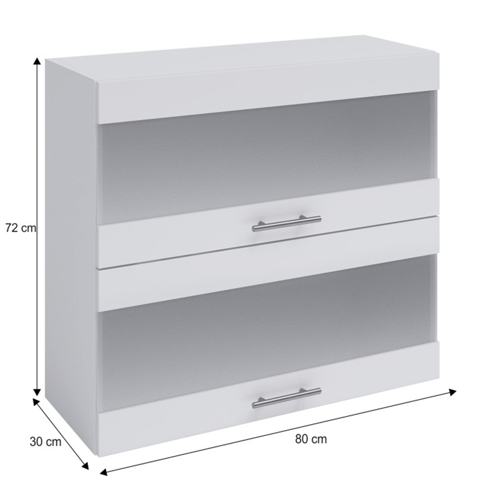 Horná skrinka W80K2S, Materiál: DTD laminová,Farebné prevedenie: biela, Rozmery ŠxVxH: 80x72x30 cm.Hrúbka materiálu: 16 mm Dodávané v demonte.Skrinky základnej zostavy sú dodávané vrátane pracovnej dosky, drezová skrinka je dodávaná bez pracovnej dosky. Sektorové skrinky sú dodávané bez pracovnej dosky.Možnosť zakúpenia pracovnej dosky Fabiana Metalic brown sivá s hrúbkou 2,8 cm,šírkou 60 cm a cenou za bm 49 Eur.Možnosť dokúpenia univerzálneho Ľ/P drezu LAY ON.