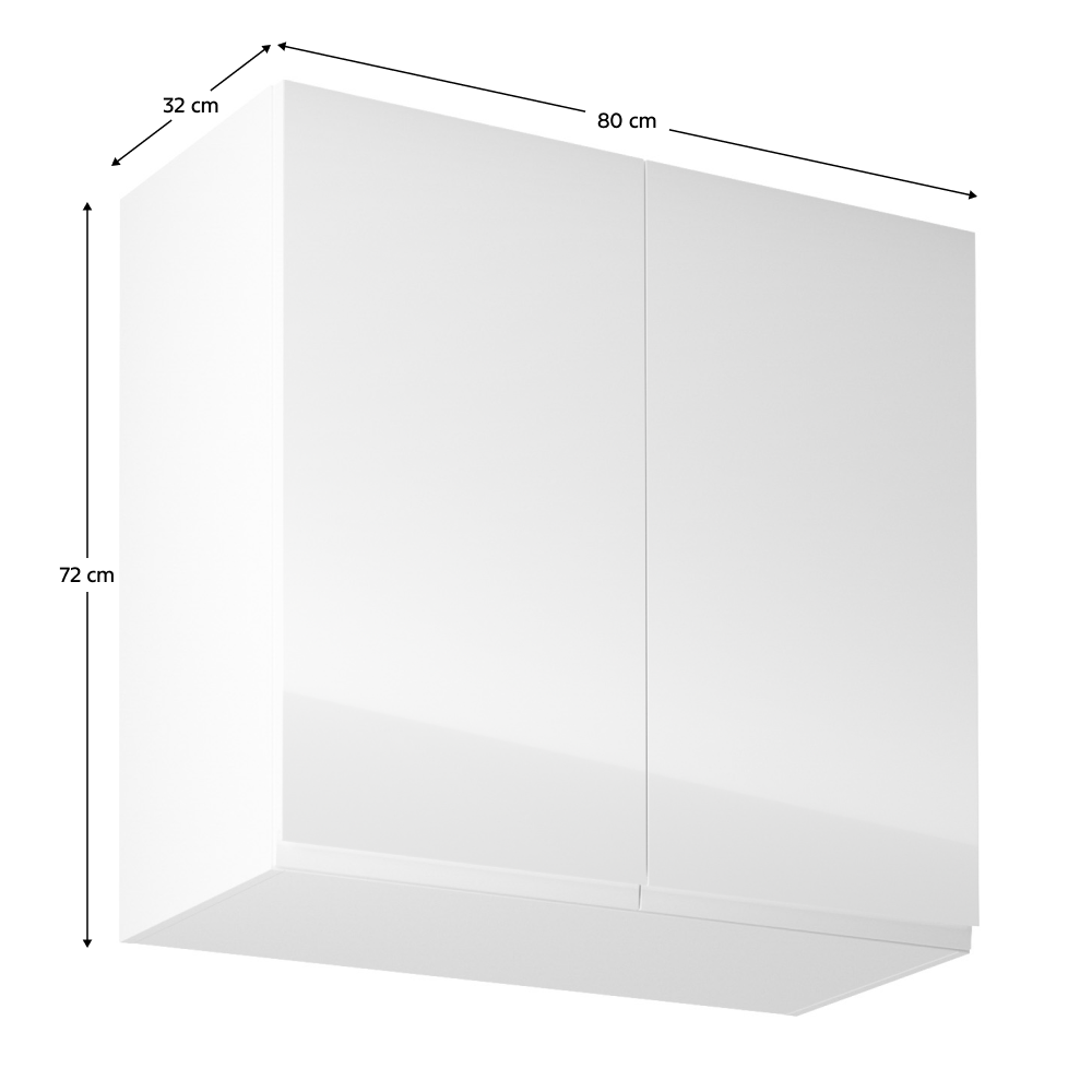 Horná skrinka, Aurora G80Prevedenie: DTD laminová/MDFFarba: biela/biela lakovaná extra vysoký lesk Rozmery (ŠxHxV): 80x32x72 cmHrúbka materiálu: 15 mmSystém tichého zatvárania dvierokPracovná doska nie je súčasťou skriniek. Je možné si doobjednať pracovnú dosku v prevedení dub artisan s hrúbkou 38 mm za 56 eur/bm. Možnosť dokúpiť drez LAY ON. Spodné skrinky sú dodávané vrátane dolnej lišty, avšak presný rozmer, ktorý potrebujete, je potrebné uviesť do poznámky v objednávke. Ak rozmer neuvediete, môže sa stať, že vám sokel nebude dodaný. Ku každej dolnej skrinke, okrem D25PZ, je potrebné doobjednať 2 ks úchytok na sokel - cena 1Eur/2ks.