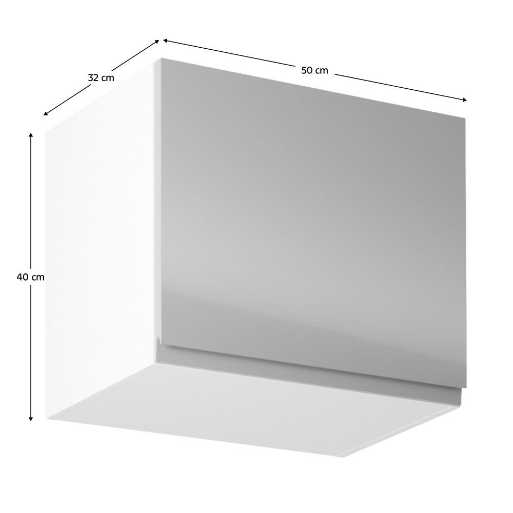 Horná skrinka, Aurora G50Prevedenie: DTD laminovaná/MDFFarba: biela/sivá lakovaná extra vysoký lesk Rozmery (ŠxHxV): 50x32x40 cmHrúbka materiálu: 15 mmSystém tichého zatvárania dvierokPracovná doska nie je súčasťou skriniek. Je možné si doobjednať pracovnú dosku v prevedení dub artisan s hrúbkou 38 mm za 56 eur/bm. Možnosť dokúpiť drez LAY ON. Spodné skrinky sú dodávané vrátane dolnej lišty, avšak presný rozmer, ktorý potrebujete, je potrebné uviesť do poznámky v objednávke. Ak rozmer neuvediete, môže sa stať, že vám sokel nebude dodaný. Ku každej dolnej skrinke, okrem D25PZ, je potrebné doobjednať 2 ks úchytok na sokel - cena 1Eur/2ks.