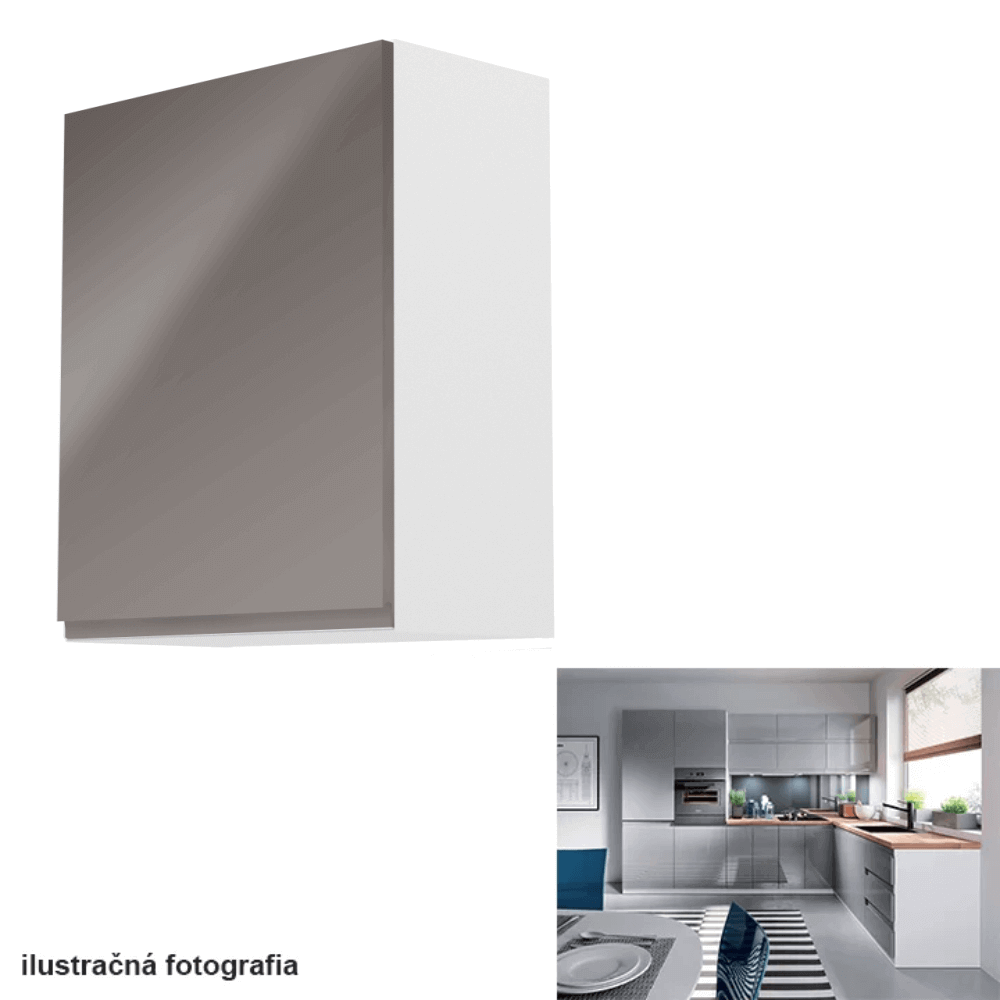 KONDELA Horná skrinka, biela/sivý extra vysoký lesk, ľavá, AURORA G601F
