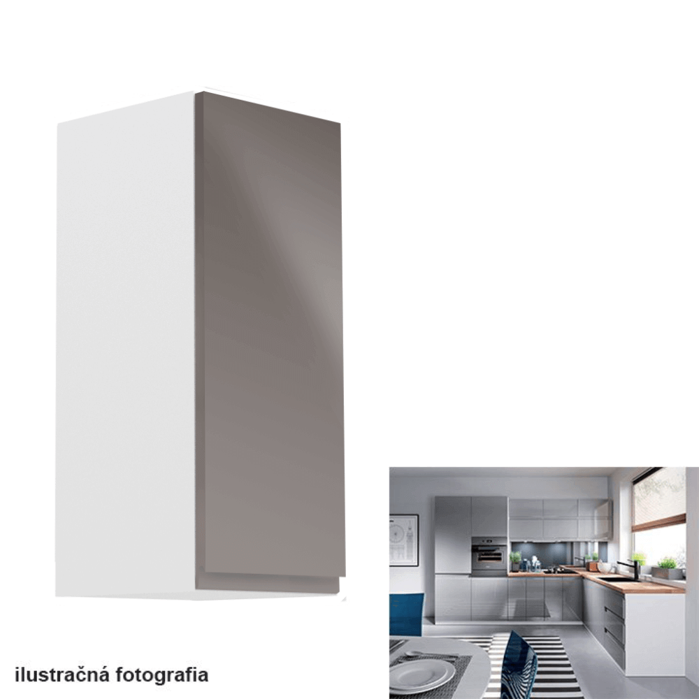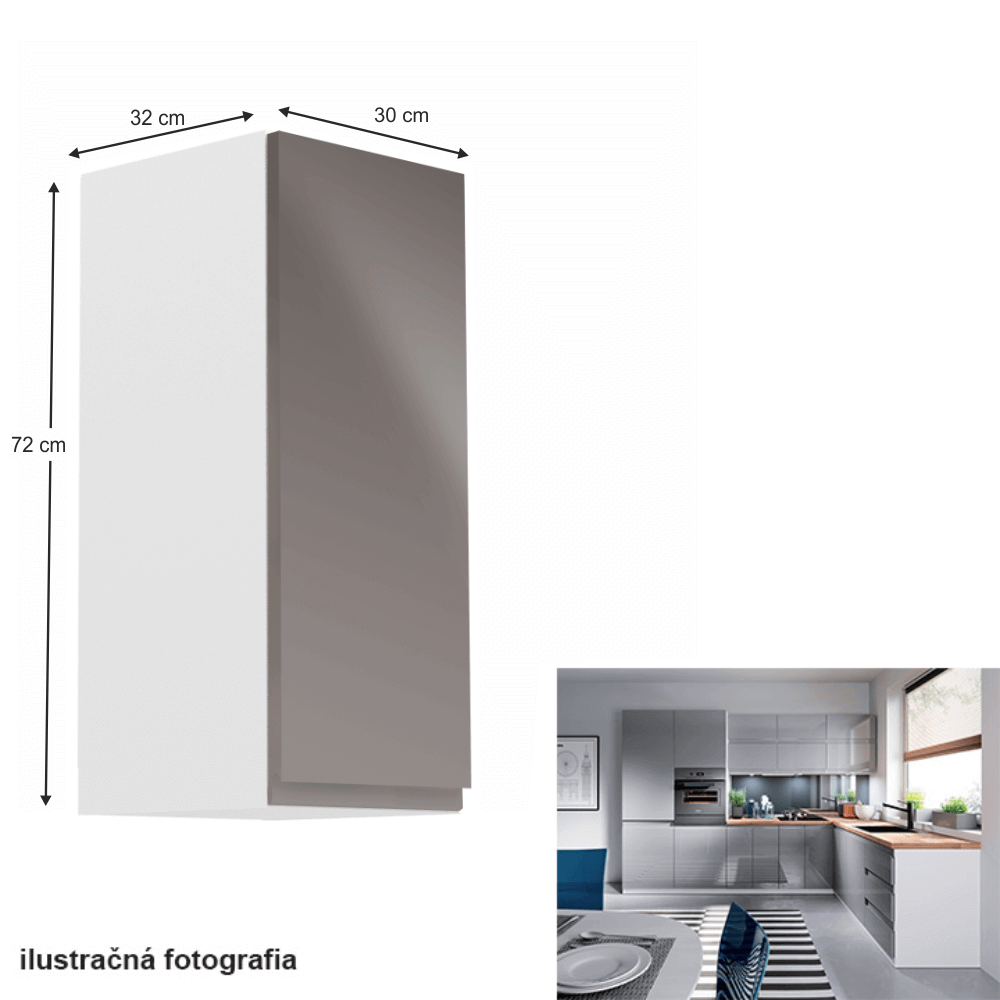 Horná skrinka, Aurora G30Prevedenie: DTD laminovaná/MDFFarba: biela/sivá lakovaná extra vysoký lesk Rozmery (ŠxHxV): 30x32x72 cmHrúbka materiálu: 15 mmSystém tichého zatvárania dvierokPracovná doska nie je súčasťou skriniek. Je možné si doobjednať pracovnú dosku v prevedení dub artisan s hrúbkou 38 mm za 56 eur/bm. Možnosť dokúpiť drez LAY ON. Spodné skrinky sú dodávané vrátane dolnej lišty, avšak presný rozmer, ktorý potrebujete, je potrebné uviesť do poznámky v objednávke. Ak rozmer neuvediete, môže sa stať, že vám sokel nebude dodaný. Ku každej dolnej skrinke, okrem D25PZ, je potrebné doobjednať 2 ks úchytok na sokel - cena 1Eur/2ks.