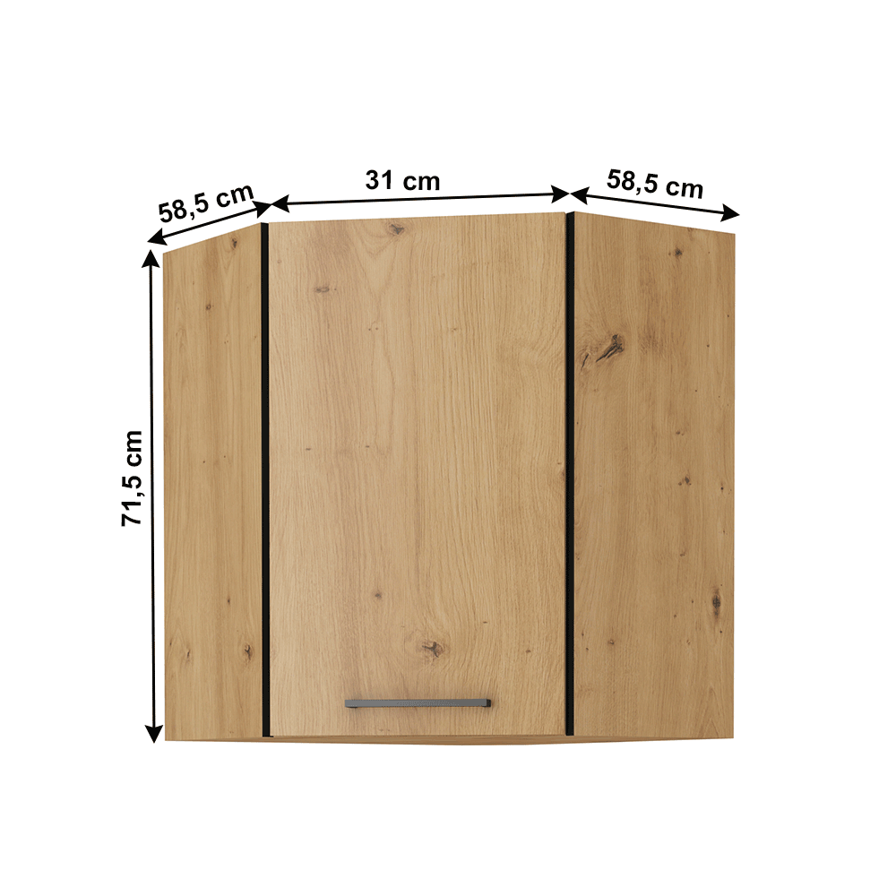 Materiál: laminovaná DTDFarba: dub artisanRozmery (ŠxHxV): 58,5/58,5x31x71,5 cmHrúbka materiálu: 1,6 cmRohováJednodverováS úchytkouÚchytka: 19,2 cmTichý doraz dvierokVnútro skrinky je bieleModerný dynamický dizajnDodávané v demontePracovnú dosku dub artisan s hrúbkou 3,8cm je možné doobjednať za cenu 65 EURMožnosť dokúpiť univerzálny drez LAY ON.