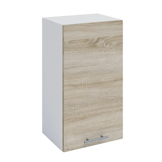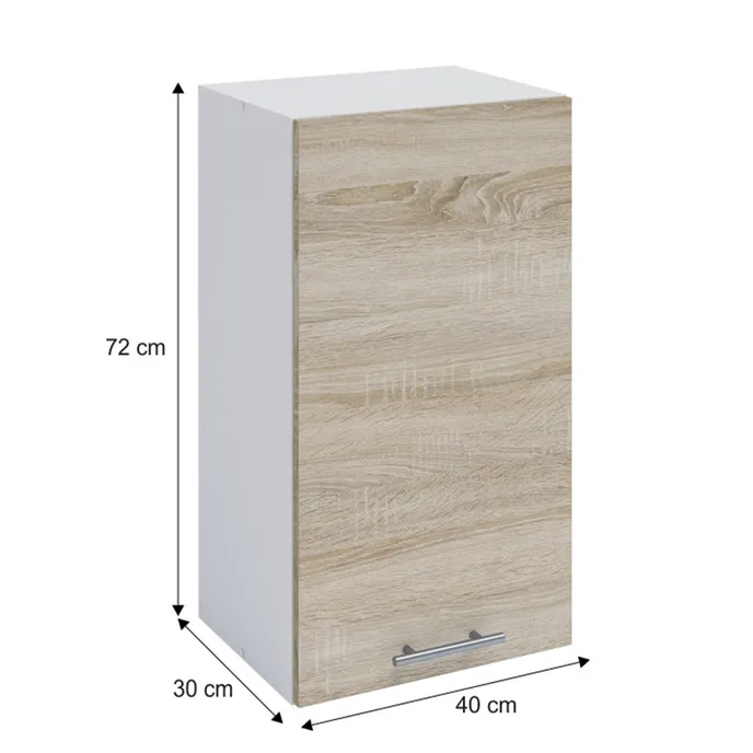 Horná skrinka W40, Materiál: DTD laminová, Farebné prevedenie: dub sonoma/biela, Korpus: biela, dvierka: dub sonoma.Rozmery ŠxVxH: 40x72x30 cm.Hrúbka materiálu: 16 mm Dodávané v demonte.Skrinky majú štandardtne predvŕtané pánty na pravej strane, montážny návod môže byť len ilustračný.Skrinky základnej zostavy sú dodávané vrátane pracovnej dosky, drezová skrinka je dodávaná bez pracovnej dosky. Sektorové skrinky sú dodávané bez pracovnej dosky.Cena pracovnej dosky je: 1bm: 49 eurMožnosť dokúpenia univerzálneho Ľ/P drezu LAY ON