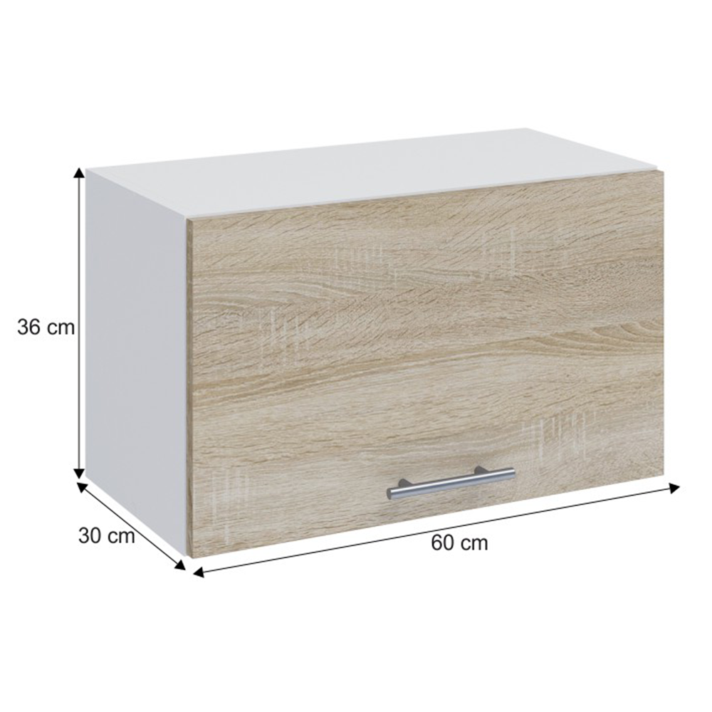 Horná skrinka W60, Materiál: DTD laminová, Farebné prevedenie: dub sonoma/biela,Korpus: biela, dvierka: dub sonoma. Rozmery ŠxVxH: 60x36x30 cm. Hrúbka materiálu: 16 mm Dodávané v demonte.Skrinky majú štandardtne predvŕtané pánty na pravej strane, montážny návod môže byť len ilustračný.Skrinky základnej zostavy sú dodávané vrátane pracovnej dosky, drezová skrinka je dodávaná bez pracovnej dosky. Sektorové skrinky sú dodávané bez pracovnej dosky.Cena pracovnej dosky je: 1bm: 49 eurMožnosť dokúpenia univerzálneho Ľ/P drezu LAY ON