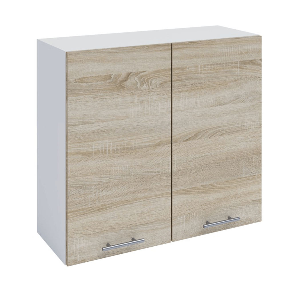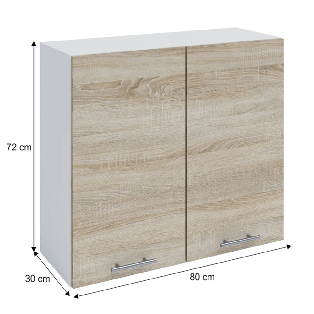 Horná skrinka W80,Materiál: DTD laminová,Farebné prevedenie: dub sonoma/biela,Korpus: biela, dvierka: dub sonoma. Rozmery ŠxVxH: 80x72x30 cm.Hrúbka materiálu: 16 mm Dodávané v demonte.Skrinky základnej zostavy sú dodávané vrátane pracovnej dosky, drezová skrinka je dodávaná bez pracovnej dosky. Sektorové skrinky sú dodávané bez pracovnej dosky.Cena pracovnej dosky je: 1bm: 49 eurMožnosť dokúpenia univerzálneho Ľ/P drezu LAY ON.