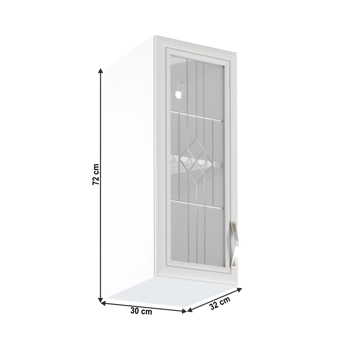Horná skrinka G30S so sklom, ľavá, ku kuchyni SICILIAPrevedenie: DTD laminovaná/MDF lišty/skloFarba: biela/sosna AndersenRozmery (ŠxHxV): 30x32x72 cmHrúbka materiálu: 15 mmSpodné skrinky ku kuchyni SICILIA sú dodávané bez pracovnej dosky. Môžete si objednať pracovnú dosku vo farebnom prevedení dub pieskovec v hrúbke 2,8 cm za 49 eur/bm a pracovnú dosku vo farebnom prevedení dub Lancelot v hrúbke 3,8 cm za 56 eur/bm.