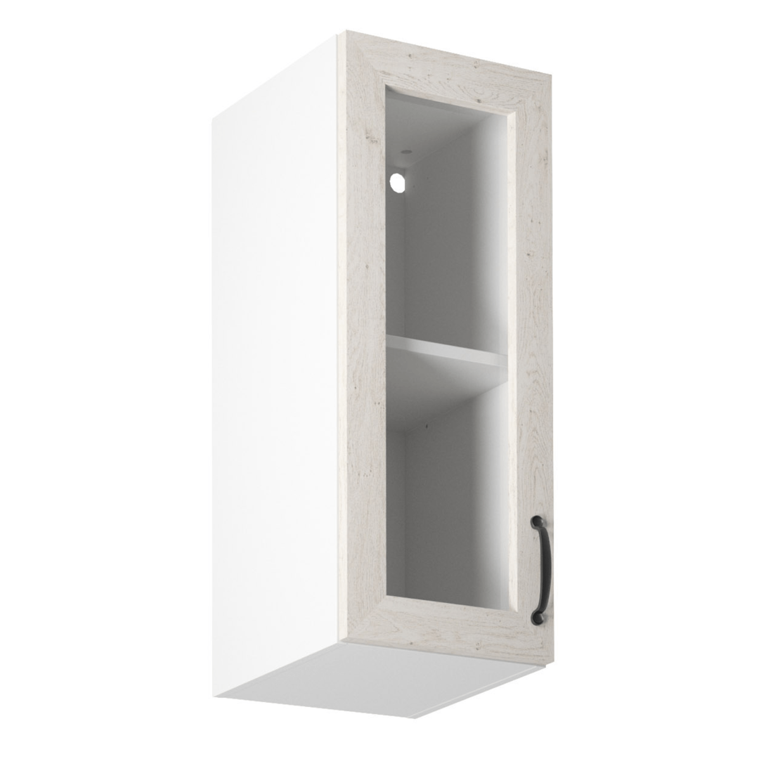 Horná skrinka s dvierkami so sklom, ROYAL G30S, ľaváMateriál: korpus je vyrobený z kvalitnej laminovanej drevotriesky/kovová úchytka/skloFarba: biela/dvierka v prevedení sosna nordickáRozmery ŠxHxV: 30x32x72 cm Hrúbka materiálu: 15 mmSystém tichého zatvárania dvierokDodávané v demonte.Spodné skrinky ku kuchyni ROYAL sú dodávané bez pracovnej dosky a bez sokla. Pracovnú dosku Dub Porterhouse tmavý možné doobjednať v hrúbke 3,8 cm v cene 59 Eur/1 bm. Ku každej dolnej skrinke, okrem rohových skriniek D25PZ, je potrebné doobjednať aj sokel v prevedení dub divoký v cene 10 ur/1 bm a 2 kusy úchytov na sokel v cene 1 Eur/2 ks. Objednávku vpíšte do poznámky v objednávkovom formulári.