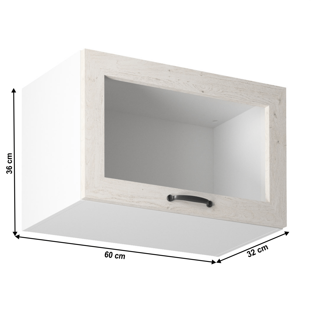 Horná skrinka s dvierkami so sklom, ROYAL G60KSNMateriál: korpus je vyrobený z kvalitnej laminovanej drevotriesky/kovová úchytka/skloFarba: biela/dvierka v prevedení sosna nordickáRozmery ŠxHxV: 60x32x36 cm Hrúbka materiálu: 15 mmDodávané v demonte.Spodné skrinky ku kuchyni ROYAL sú dodávané bez pracovnej dosky a bez sokla. Pracovnú dosku Dub Porterhouse tmavý možné doobjednať v hrúbke 3,8 cm v cene 59 Eur/1 bm. Ku každej dolnej skrinke, okrem rohových skriniek D25PZ, je potrebné doobjednať aj sokel v prevedení dub divoký v cene 10 ur/1 bm a 2 kusy úchytov na sokel v cene 1 Eur/2 ks. Objednávku vpíšte do poznámky v objednávkovom formulári.