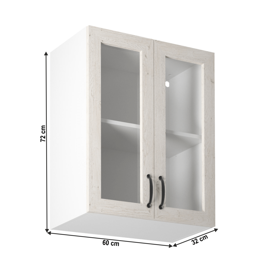 Horná skrinka s dvierkami so sklom, ROYAL G60SMateriál: korpus je vyrobený z kvalitnej laminovanej drevotriesky/kovová úchytka/skloFarba: biela/dvierka v prevedení sosna nordickáRozmery ŠxHxV: 60x32x72 cm Hrúbka materiálu: 15 mmSystém tichého zatvárania dvierokDodávané v demonte. Spodné skrinky ku kuchyni ROYAL sú dodávané bez pracovnej dosky a bez sokla. Pracovnú dosku Dub Porterhouse tmavý možné doobjednať v hrúbke 3,8 cm v cene 59 Eur/1 bm. Ku každej dolnej skrinke, okrem rohových skriniek D25PZ, je potrebné doobjednať aj sokel v prevedení dub divoký v cene 10 ur/1 bm a 2 kusy úchytov na sokel v cene 1 Eur/2 ks. Objednávku vpíšte do poznámky v objednávkovom formulári.