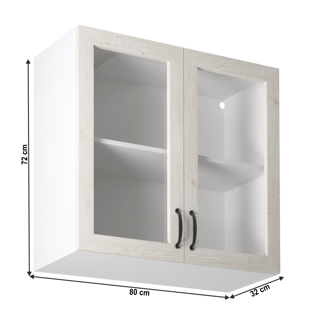 Horná skrinka so sklom s dvierkami, ROYAL G80SMateriál: korpus je vyrobený z kvalitnej laminovanej drevotriesky/kovová úchytka/skloFarba: biela/dvierka v prevedení sosna nordickáRozmery ŠxHxV: 80x32x72 cm Hrúbka materiálu: 15 mmSystém tichého zatvárania dvierokDodávané v demonte.Spodné skrinky ku kuchyni ROYAL sú dodávané bez pracovnej dosky a bez sokla. Pracovnú dosku Dub Porterhouse tmavý možné doobjednať v hrúbke 3,8 cm v cene 59 Eur/1 bm. Ku každej dolnej skrinke, okrem rohových skriniek D25PZ, je potrebné doobjednať aj sokel v prevedení dub divoký v cene 10 ur/1 bm a 2 kusy úchytov na sokel v cene 1 Eur/2 ks. Objednávku vpíšte do poznámky v objednávkovom formulári.