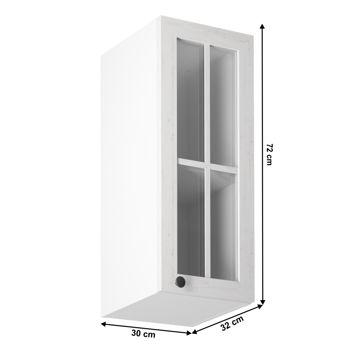 Horná, pravá skrinka s dvierkami so sklom a jednou policou ku kuchyni PROVANCEPrevedenie: DTD laminovaná/MDFFarba: biely/sosna andersenRozmery (ŠxHxV): 30x32x72 cmHrúbka materiálu: 15 mmSystém tichého zatvárania dvierokCena sektorových skriniek je uvádzaná bez pracovnej dosky a spodnej lišty. Cena za pracovnú dosku dub lancelot je 56 Eur/bm - hrúbka 38 mm, cena za spodnú lištu je 14 Eur. Ku každej dolnej skrinke okrem D25PZ, je potrebné doobjednať 2 ks úchytov na sokel cena 1 Eur/2 ks.