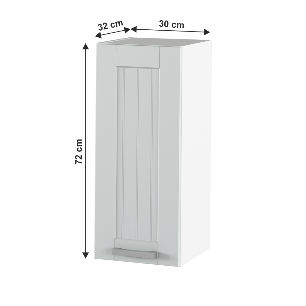 Materiál skrinka: DTD laminovaná/MDFFarba skrinka: svetlosivá/bielaMateriál úchytky: kovFarba úchytky: matný chrómRozmery (ŠxHxV): 30x32x72 cmHrúbka materiálu: 16 mmS dvierkamiPolicováS kovovou úchytkouKvalitný slovenský výrobokDodávané v demonteSkrinky sú dodávané bez pracovnej dosky. Pracovnú dosku v prevedení gold craft oak v hrúbke 38 mm je možné doobjednať v cene 45 Eur/1 bm.