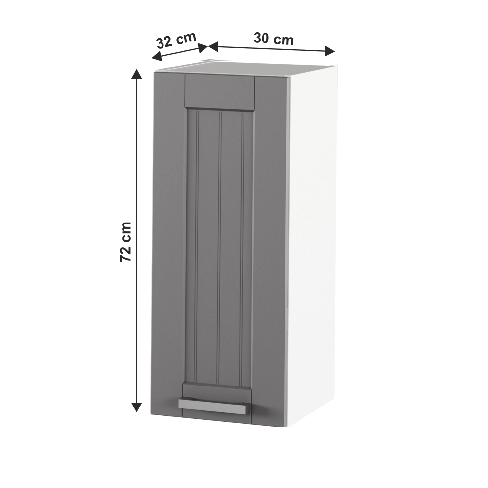 Materiál skrinka: DTD laminovaná/MDFFarba skrinka: tmavosivá/bielaMateriál úchytky: kovFarba úchytky: matný chrómRozmery (ŠxHxV): 30x32x72 cmHrúbka materiálu: 16 mmS dvierkamiPolicováS kovovou úchytkouKvalitný slovenský výrobokDodávané v demonteSkrinky sú dodávané bez pracovnej dosky. Pracovnú dosku v prevedení gold craft oak v hrúbke 38 mm je možné doobjednať v cene 45 Eur/1 bm.