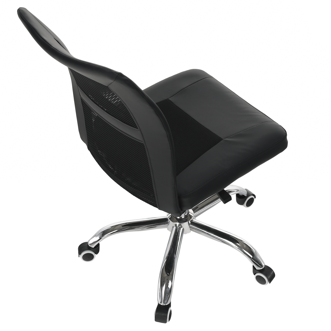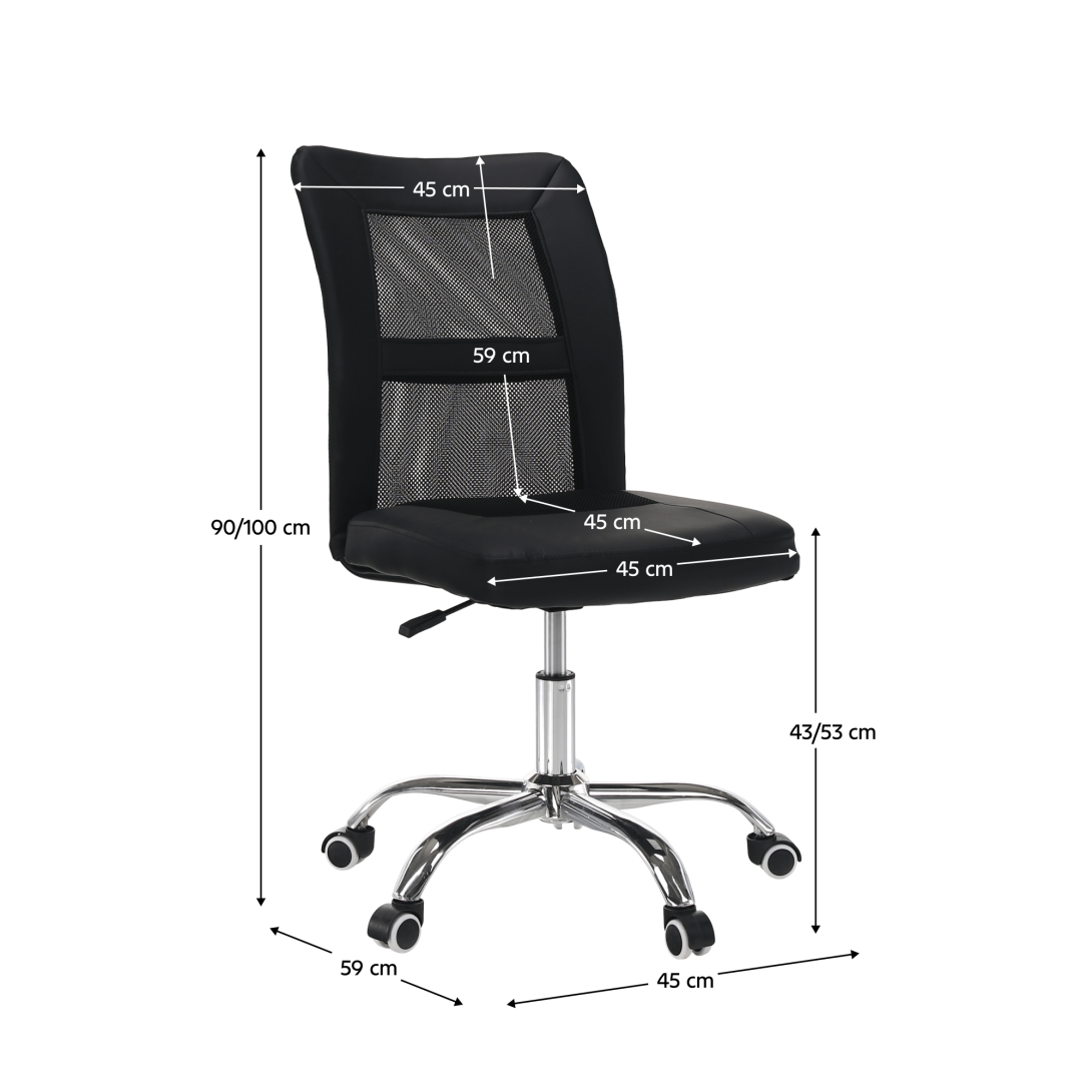 Prevedenie: čierna/chrómMateriál: sieťovina/ekokoža/chrómOderuodolnosť textílie podľa testu Martindale: 100 000 oderovOderuodolnosť textílie podľa testu Martindale: 90 000 oderovRozmery (ŠxHxV): 45x59x90-100 cmVýška sedu: 43-53 cmHĺbka sedu: 45 cmŠírka sedu: 45 cmVýška chrbtovej opierky: 59 cmŠírka chrbtovej opierky: 45 cmNosnosť: 110 kgNa kolieskachNastaviteľná výška seduOtáčaváDodávané v demonte