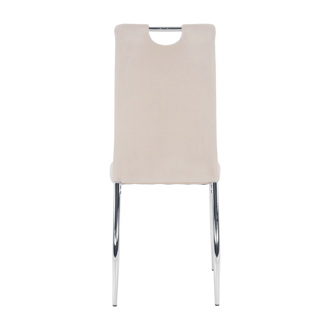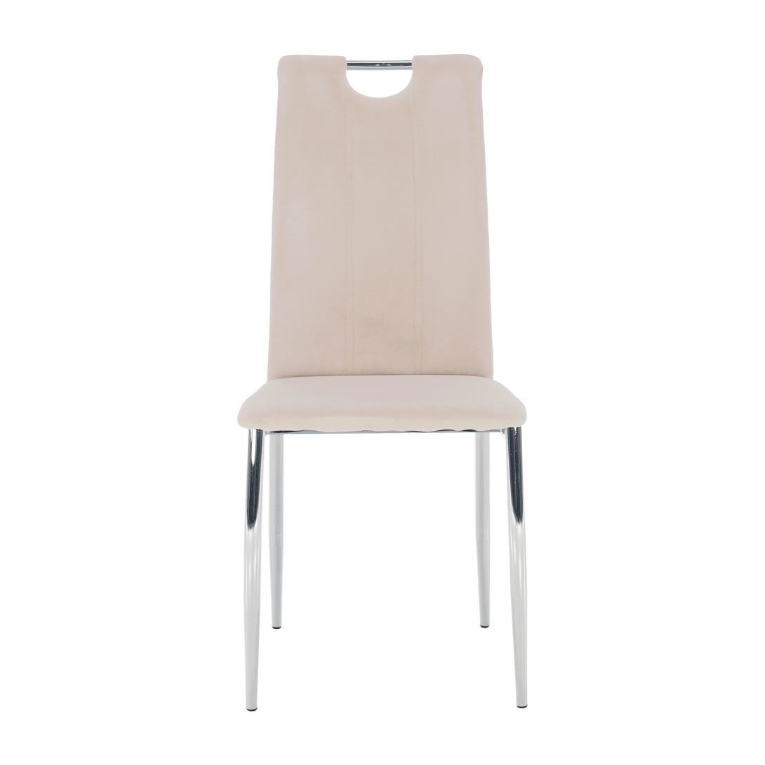Jedálenská stolička OLIVA NEW Material: Velvet látka/chrómFarba: béžová Dulux/chrómOderuodolnosť textílie podľa testu Martindale: 85 000 oderovRozmery (ŠxHxV): 42x52x97 cmHĺbka sedu: 40 cmVýška sedu: 46 cmŠírka sedu: 42 cmNosnosť: 110 kgDodávané v demonte.