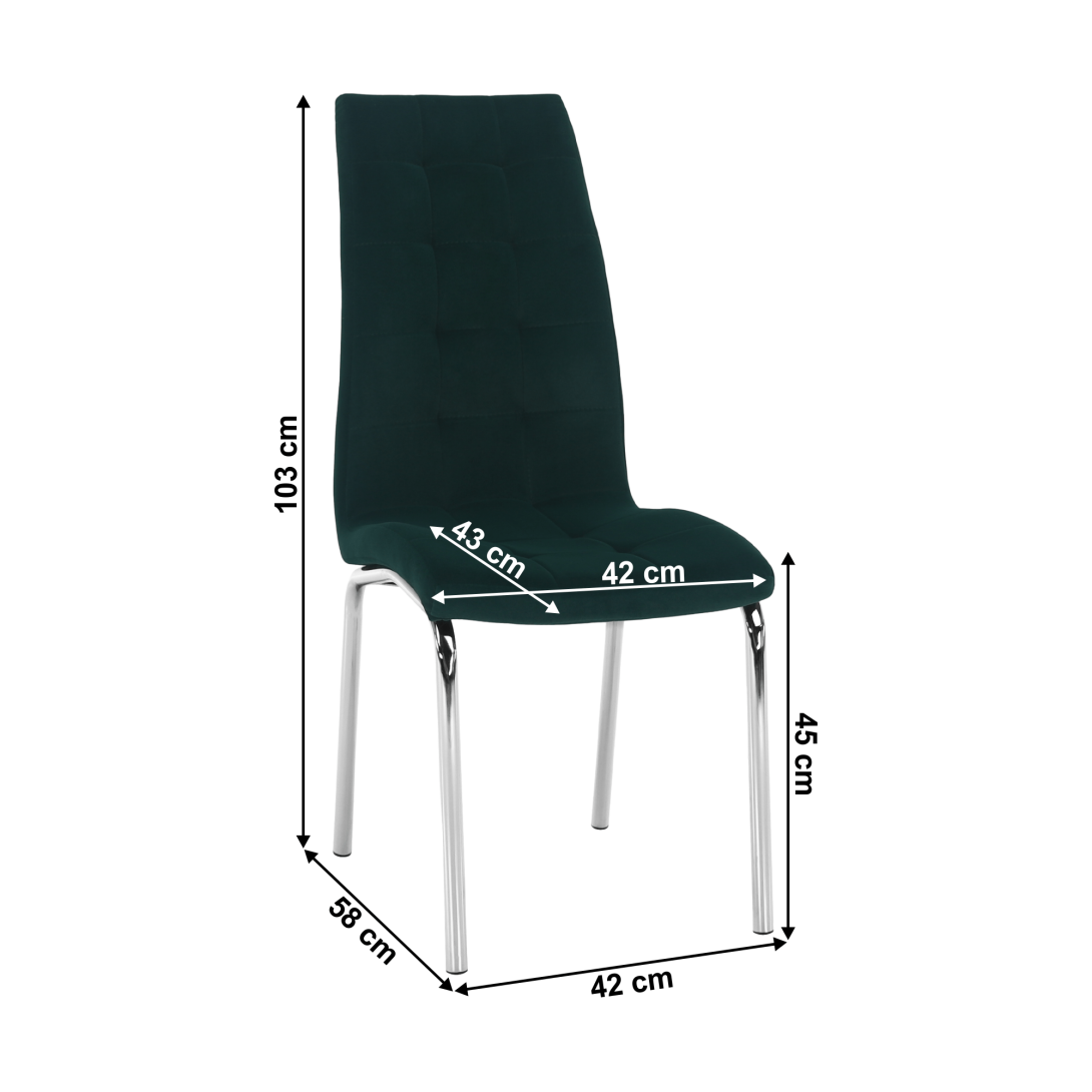 Jedálenská stolička GERDA NEWMateriál: látka/chrómOderuodolnosť textílie podľa testu Martindale: 85 000 oderovFarebné prevedenie: smaragdováRozmery (ŠxHxV): 42x58x103cmHĺbka sedenia: 43 cmVýška sedenia: 45 cmŠírka sedenia: 42 cmNosnosť: 110 kgDodávané v demonte.