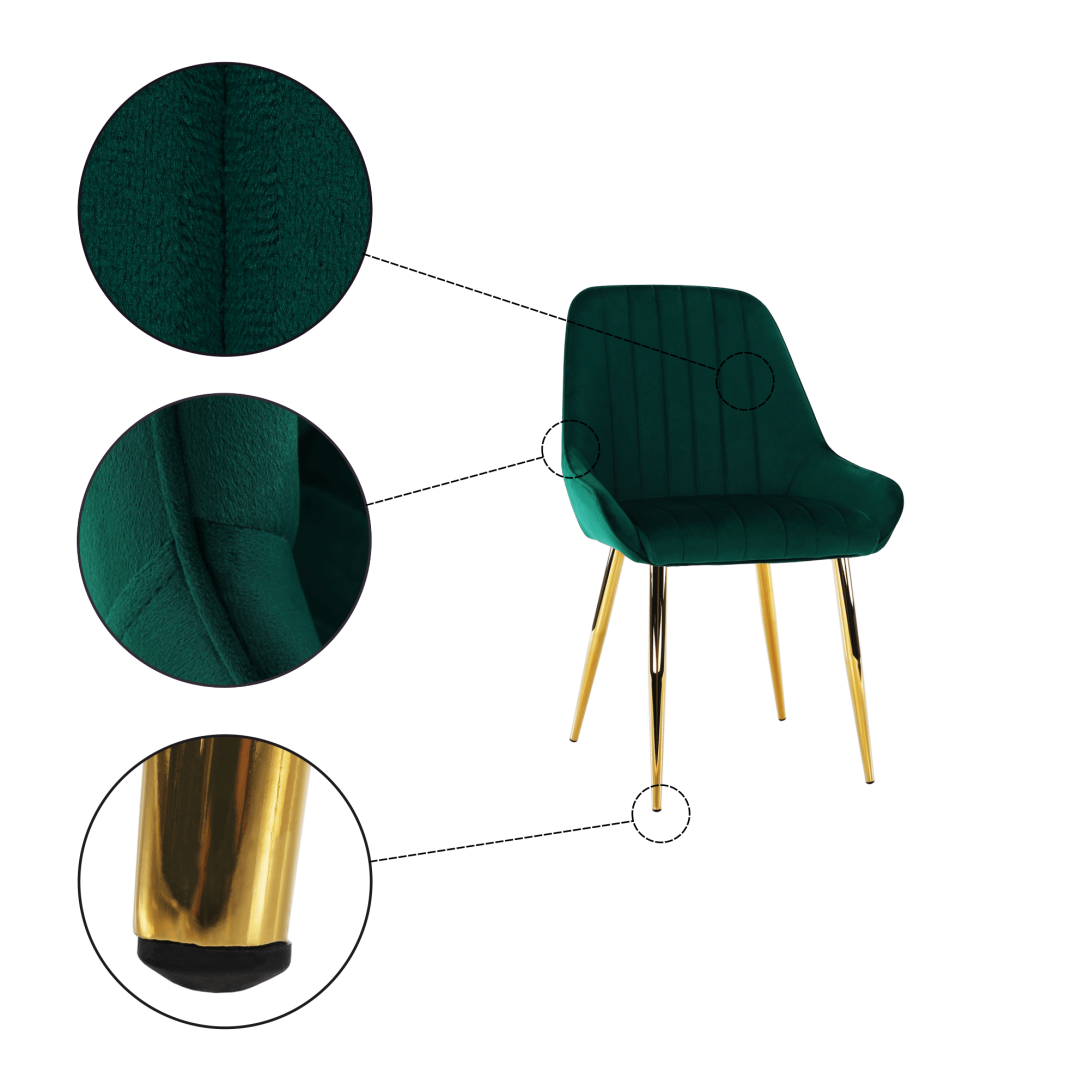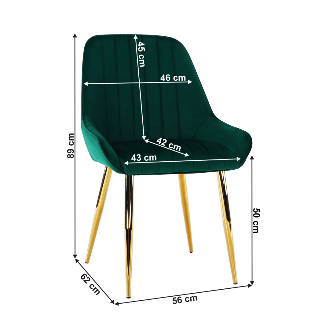 Materiál: látka Velvet/chrómOderuodolnosť textílie podľa testu Martindale: 95 000 oderovFarba: smaragdová/gold chróm-zlatáRozmery (ŠxHxV): 56x62x89 cmVýška sedu: 50 cmHĺbka sedu: 42 cmŠírka sedu: 43 cmRozmery chrbtovej opierky (ŠxV): 46x45 cmModernáNosnosť: 90 kgAtraktívny vzhľadObsahuje plastové krytky chrániace podlahuDodávané v demonte