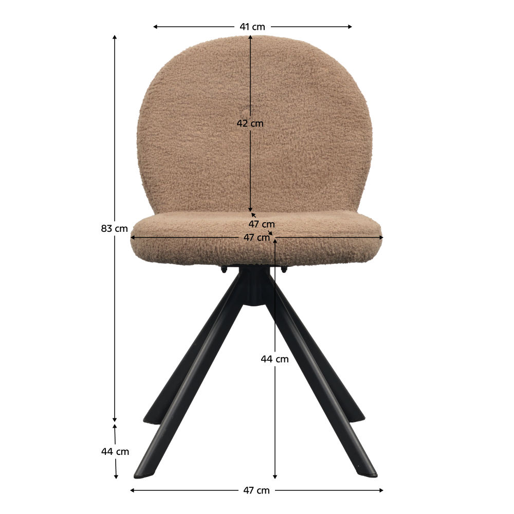 Materiál: látka Bouclé/kovOderuodolnosť textílie podľa testu Martindale: 45 000 oderovFarba: svetlohnedá/čiernaRozmery (ŠxHxV): 47x44x83 cmVýška sedu: 44 cmŠírka sedu: 47 cmHĺbka sedu: 47 cmVýška chrbtovej opierky: 42 cmŠírka chrbtovej opierky: 41 cmNosnosť: 100 kgHmotnosť: 6,2 kgOtočnáJedálenskáDizajnováDodávané v demonte