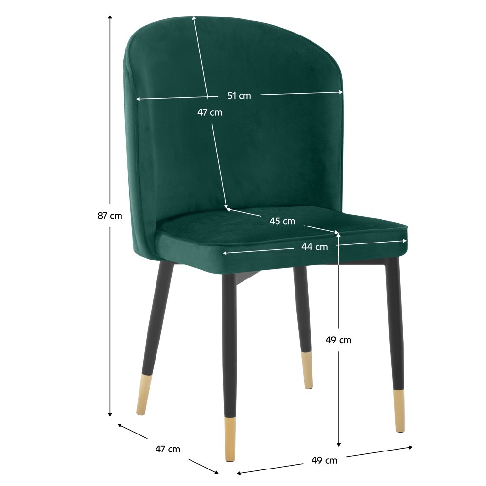 Materiál: Velvet látka/kovOderuodolnosť textílie podľa testu Martindale: 85 000 oderovFarba: zelená/čierna/zlatáRozmery (ŠxHxV): 49x47x87 cmVýška sedu: 49 cmHĺbka sedu: 45 cmŠírka sedu: 44 cmVýška chrbtovej opierky: 47 cmŠírka chrbtovej opierky: 51 cmZaoblené operadloDekoratívne prešívanáJedálenskáDizajnováNosnosť: 90 kgDodávané v demonte