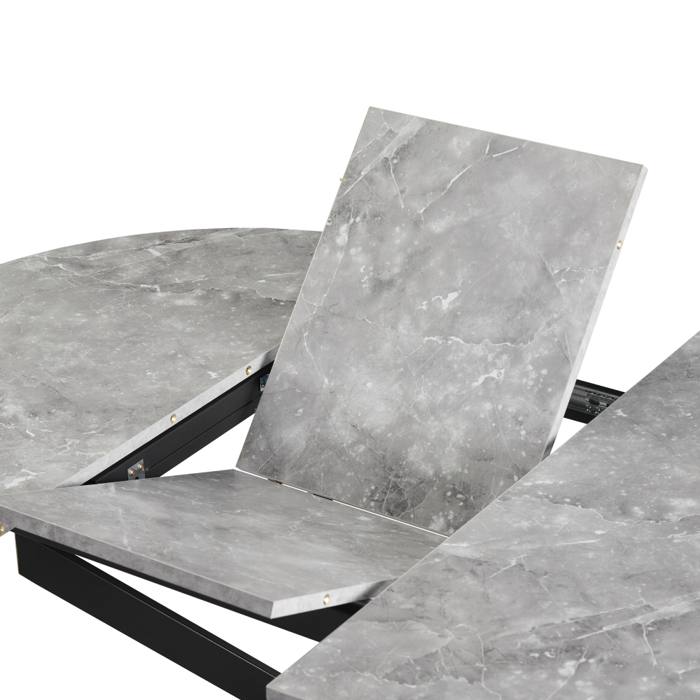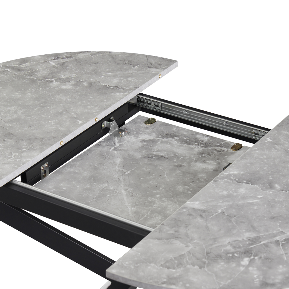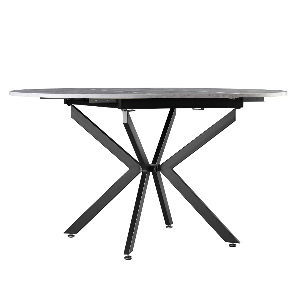 Materiál doska stola: MDFFarba: betónKonštrukcia nohy: kovFarba: čiernaRozmery (ŠxHxV): 100x100-140x75 cm Hrúbka materiálu vrchnej dosky: 1,8 cmOkrúhlyPraktickýVhodný pre 4-6 osôbNosnosť: 25 kgDodávané v demonte