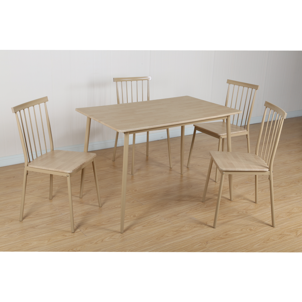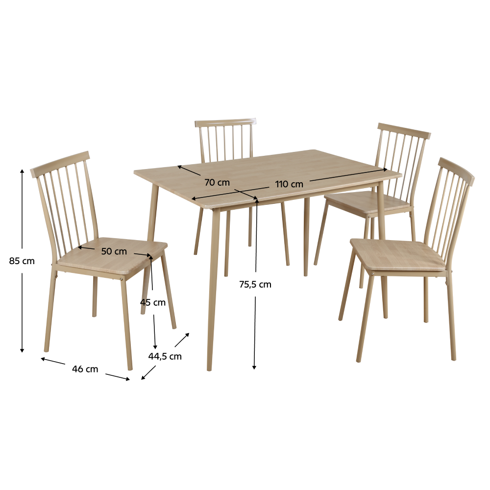 Materiál: MDF/kovFarba: buk prírodnýRozmery stôl (ŠxHxV): 110x70x75,5 cmHrúbka stolovej dosky: 1,5 cmRozmery stoličky (ŠxHxV): 44,5x46x85 cmVýška sedu: 45 cmHĺbka sedu: 50 cmNosnosť stola: 20 kgNosnosť stoličky: 90 kgJedálenský set1 stôl4 stoličkyPre 4 osobyModernýDodávané v demonte