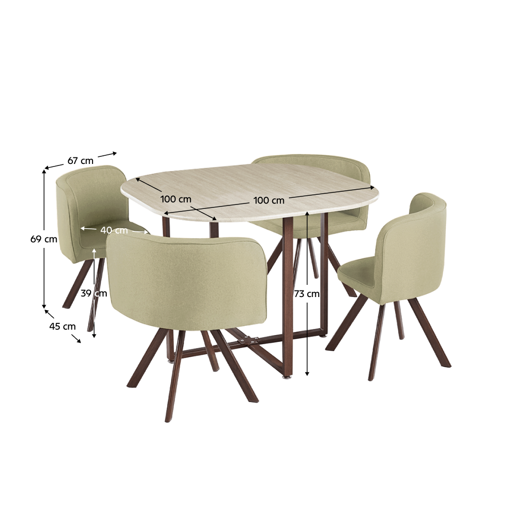 Materiál stôl: MDF/kovMateriál stolička: látka/kovOderuodolnosť látky podľa testu Martindale: 80 000 oderovFarba stôl: svetlohnedá/prírodnáFarba stolička: svetlohnedá/prírodnáRozmery stôl (PxV): 100x73 cmNosnosť stola: 15 kgRozmery kresla (ŠxHxV): 67x45x69 cmVýška sedu: 39 cmHĺbka sedu: 40 cmNosnosť stoličky: 90 kgJeden stôlŠtyri stoličkyDodávané v demonte
