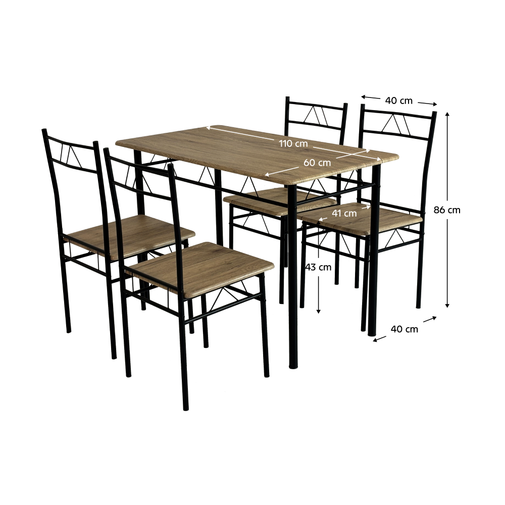 Materiál: MDF/kovFarba: dub svetlý/čiernaRozmery stôl (ŠxHxV): 110x60x74 cmRozmery stolička (ŠxHxV): 40x40x86 cmVýška sedu: 43 cmHĺbka sedu: 41 cmHrúbka MDF: 1,5 cmPriemer nôh stôl: 3,2 cmPriemer nôh stolička: 1,9 cmNosnosť stôl: 20 kgNosnosť stolička: 90 kgJedálenský set1 stôl4 stoličkyPre 4 osobyDodávané v demonte