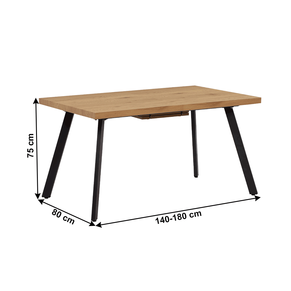 Materiál konštrukcia: kovFarba konštrukcie: čiernaDoska stola: MDFFarba: dubRozmery (ŠxHxV): 140-180x80x75 cmHrúbka materiálu vrchnej dosky: 4 cmMinimalistický dizajnRozkladacíJednoduchý Klasické prevedenieKovové nohyJednoduchá údržbaS klzákmi pre ochranu podlahyVhodný pre 6-8 osôbNosnosť stola: 40 kgDodávané v demonte