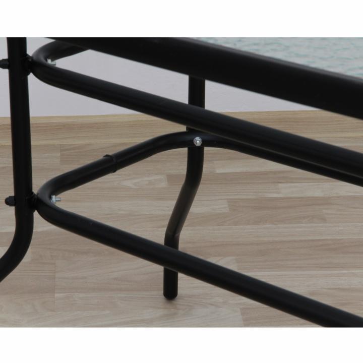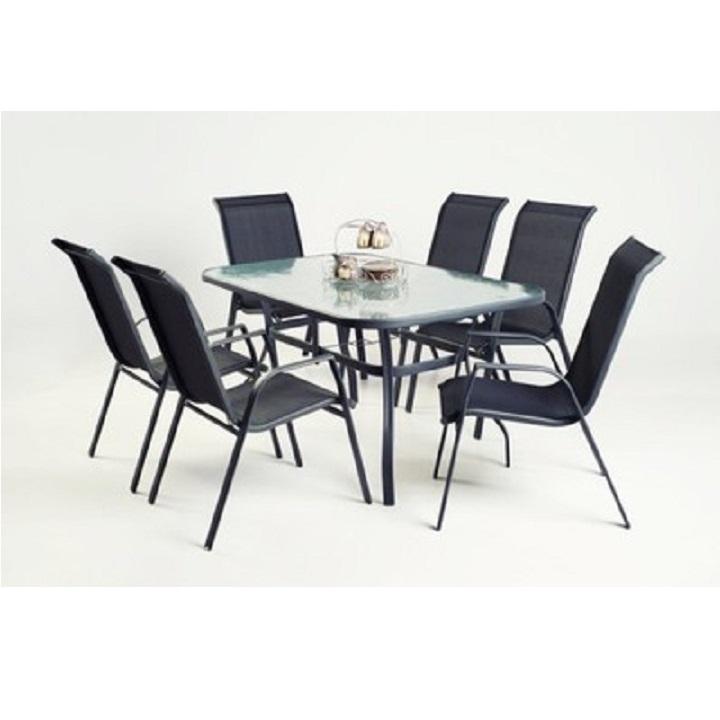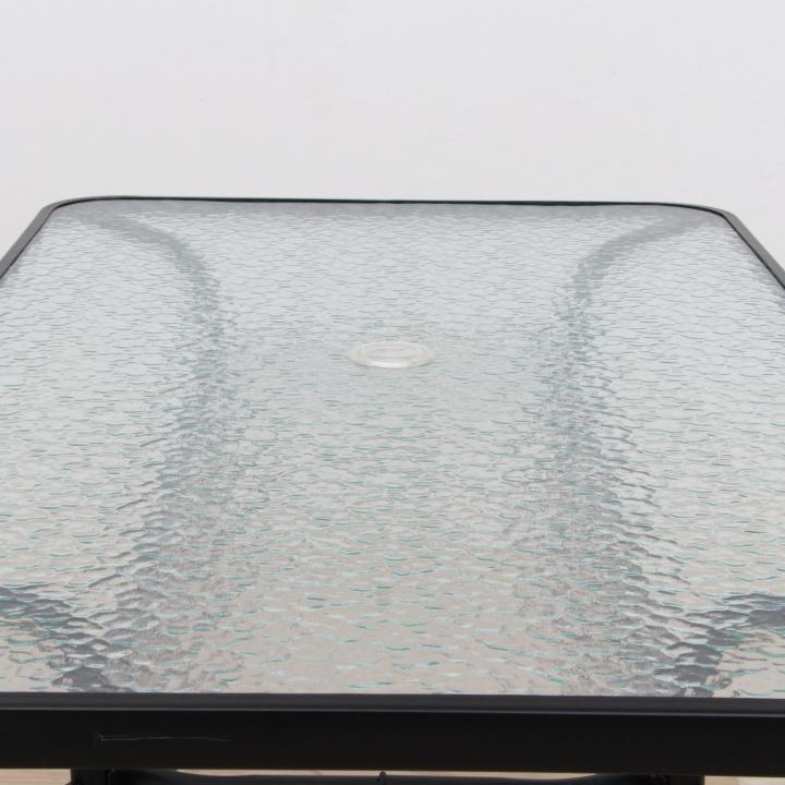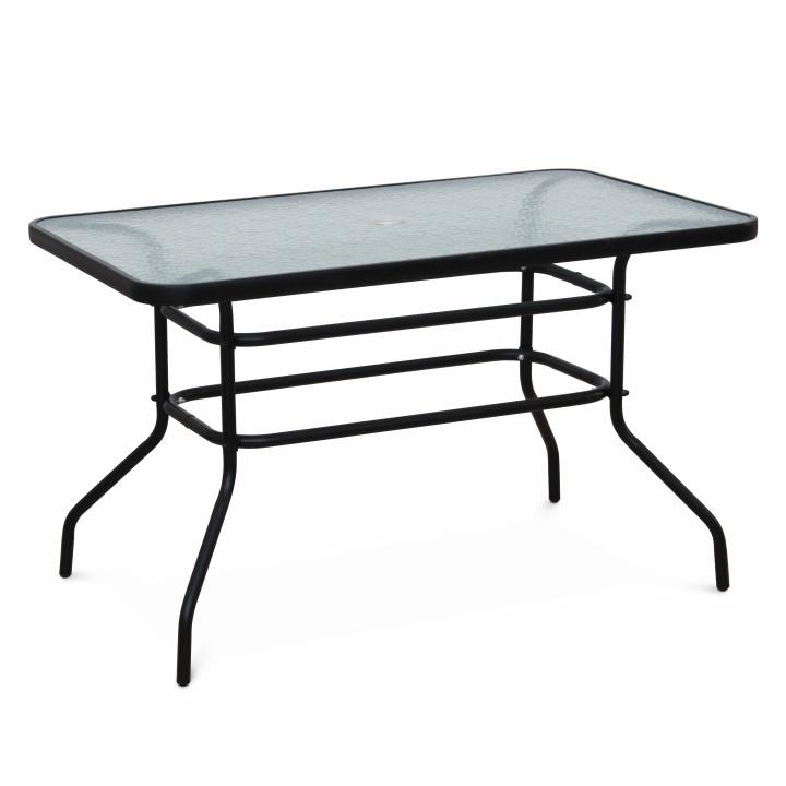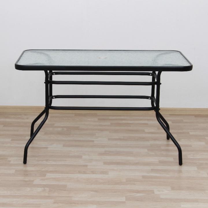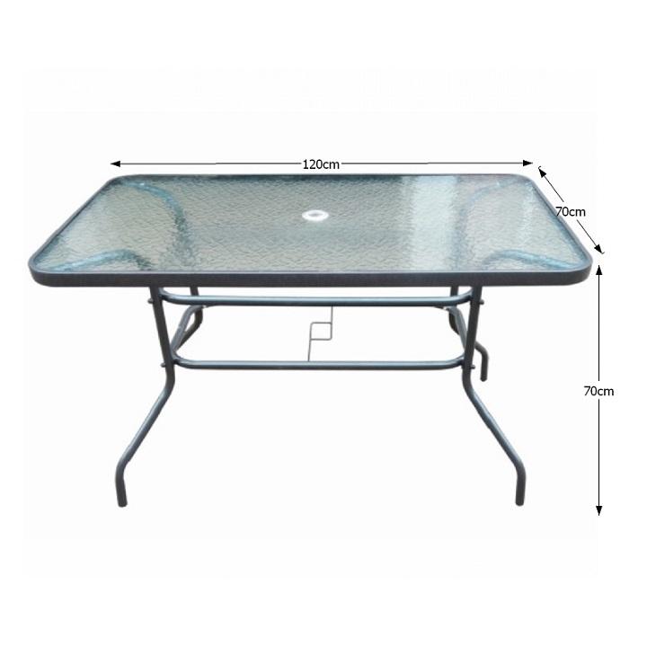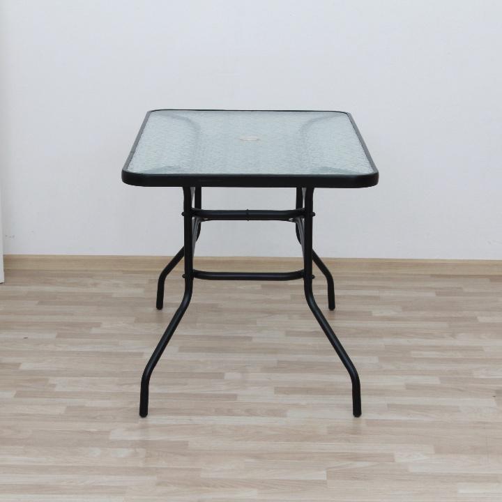 Jedálenský stôl vhodný k záhradnému setu DEMATMateriál: tvrdené sklo/oceľFarba: čiernaRozmery (ŠxHxV): 120x70x70 cmS otvorom na osadenie slnečníkaDodávaný v demonte