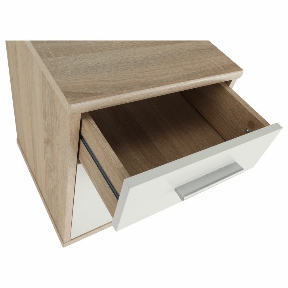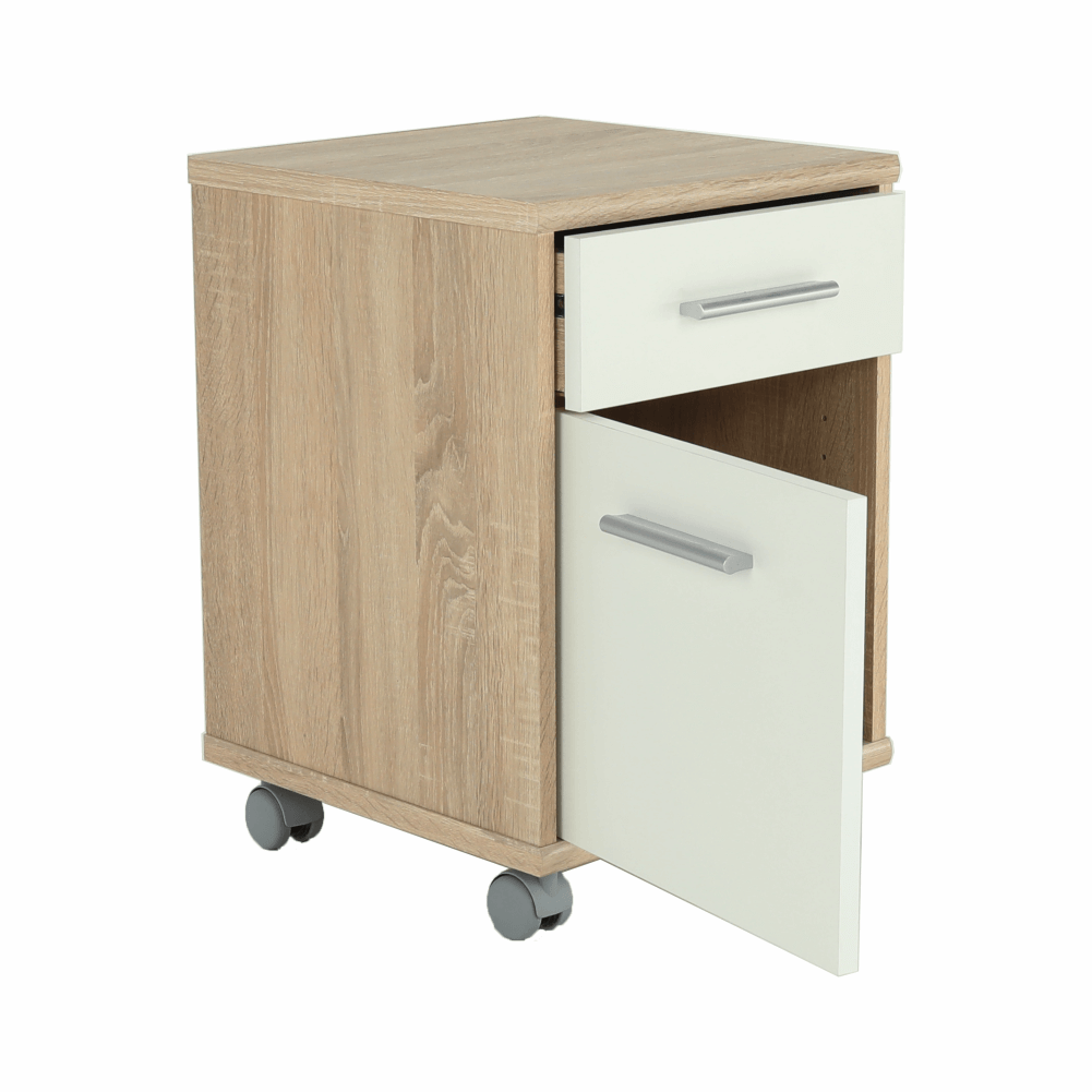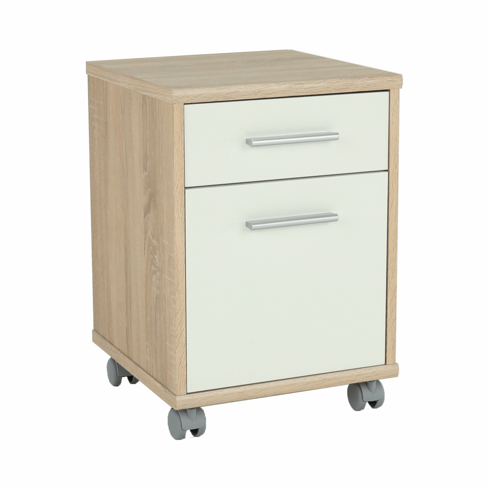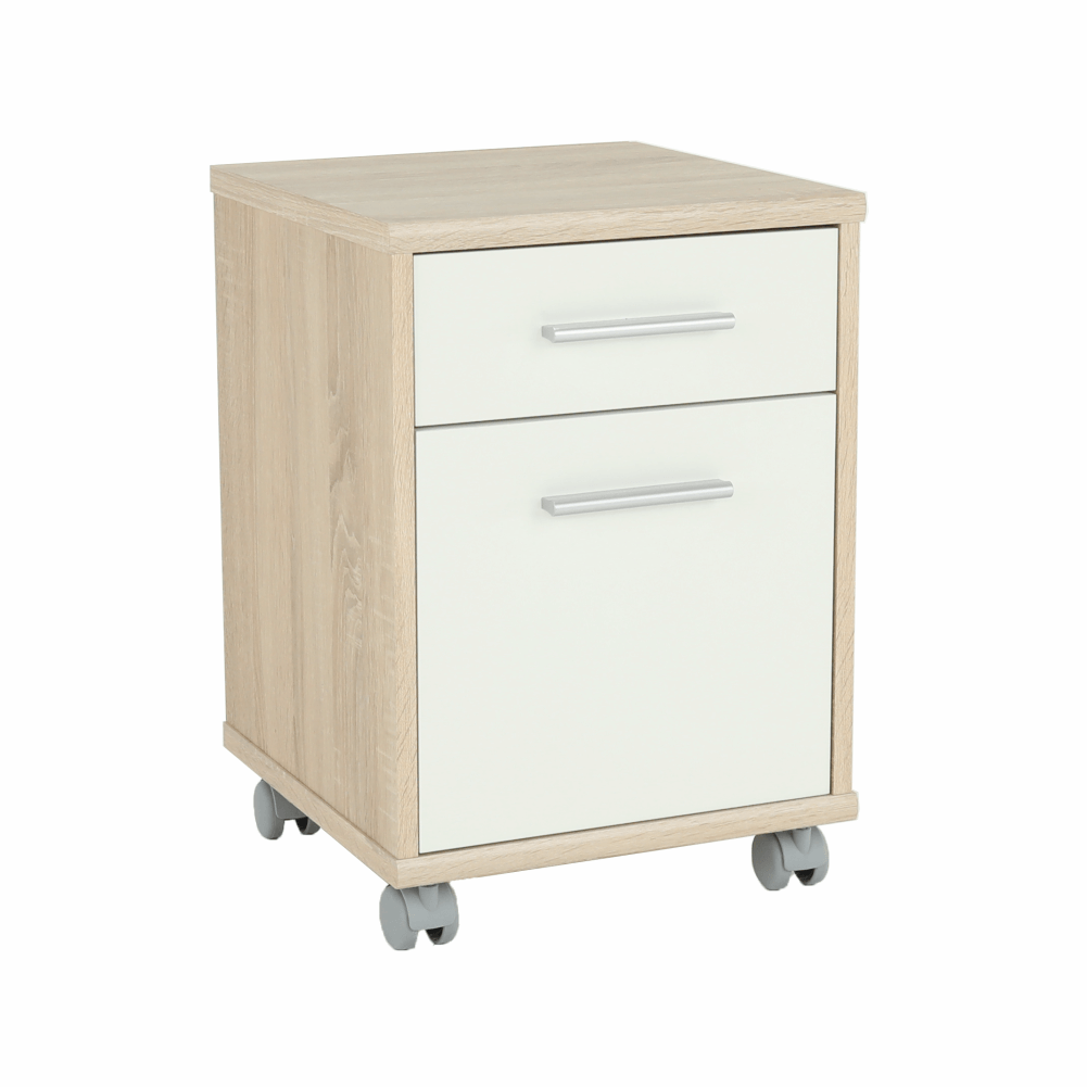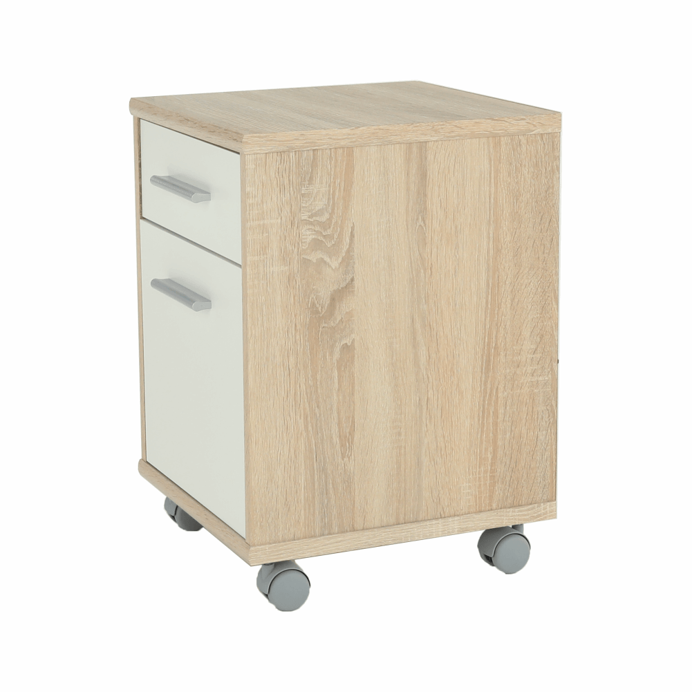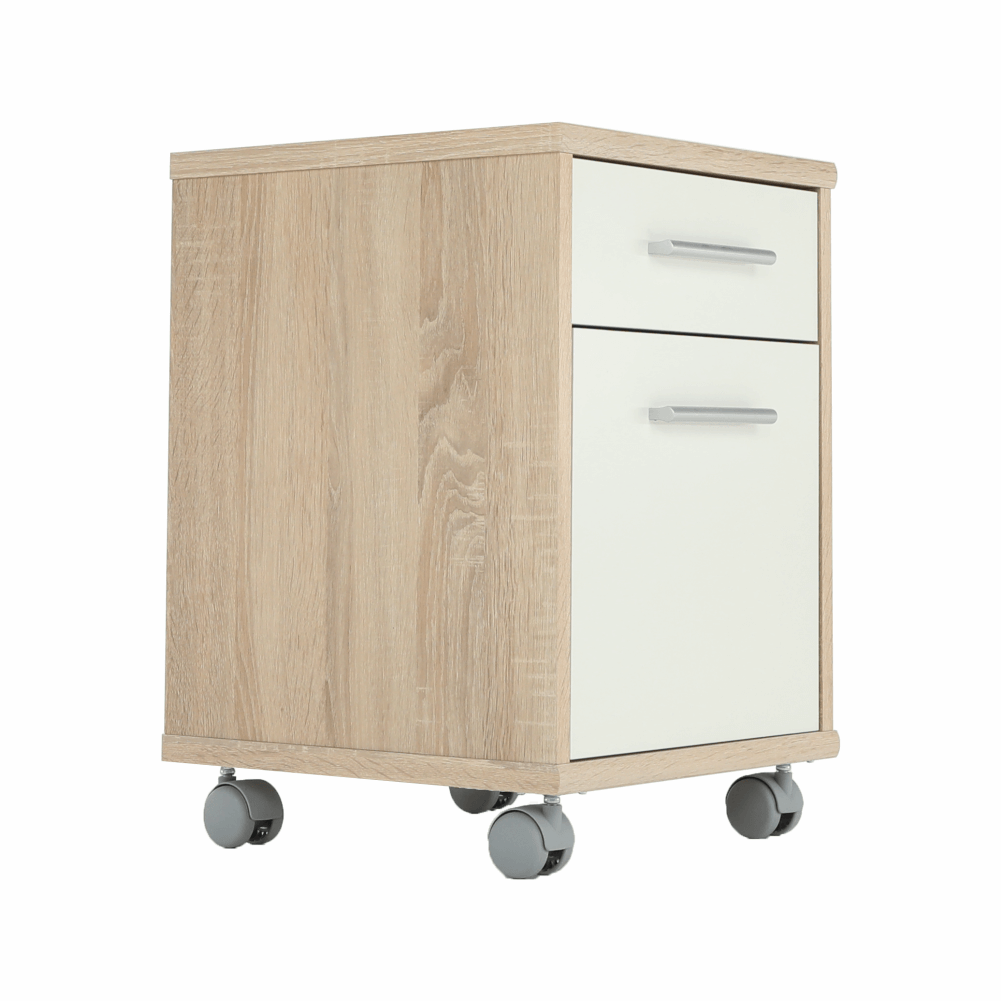 kancelársky kontajner JOHAN 2 NEW 07 s jedným šuplíkom a skrinkoufarebné prevedenie: dub sonoma/biela, materiál: DTD lamiovaná/ABS hranyRozmery (ŠxHxV): 39x40,5x55 cmRozmery šuplíka (ŠxHxV): 34,8x35x12,5 cmRozmery skrinky (ŠxHxV): 35,2x38x34,8 cmHrúbka materiálu: 16/22 mm Štyri kolieskaSlovenský výrobokDodávané v demonte