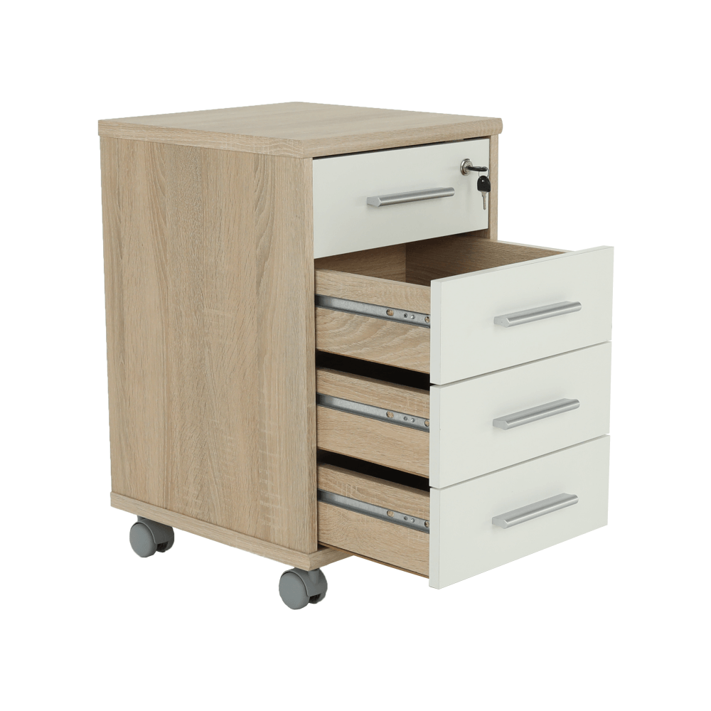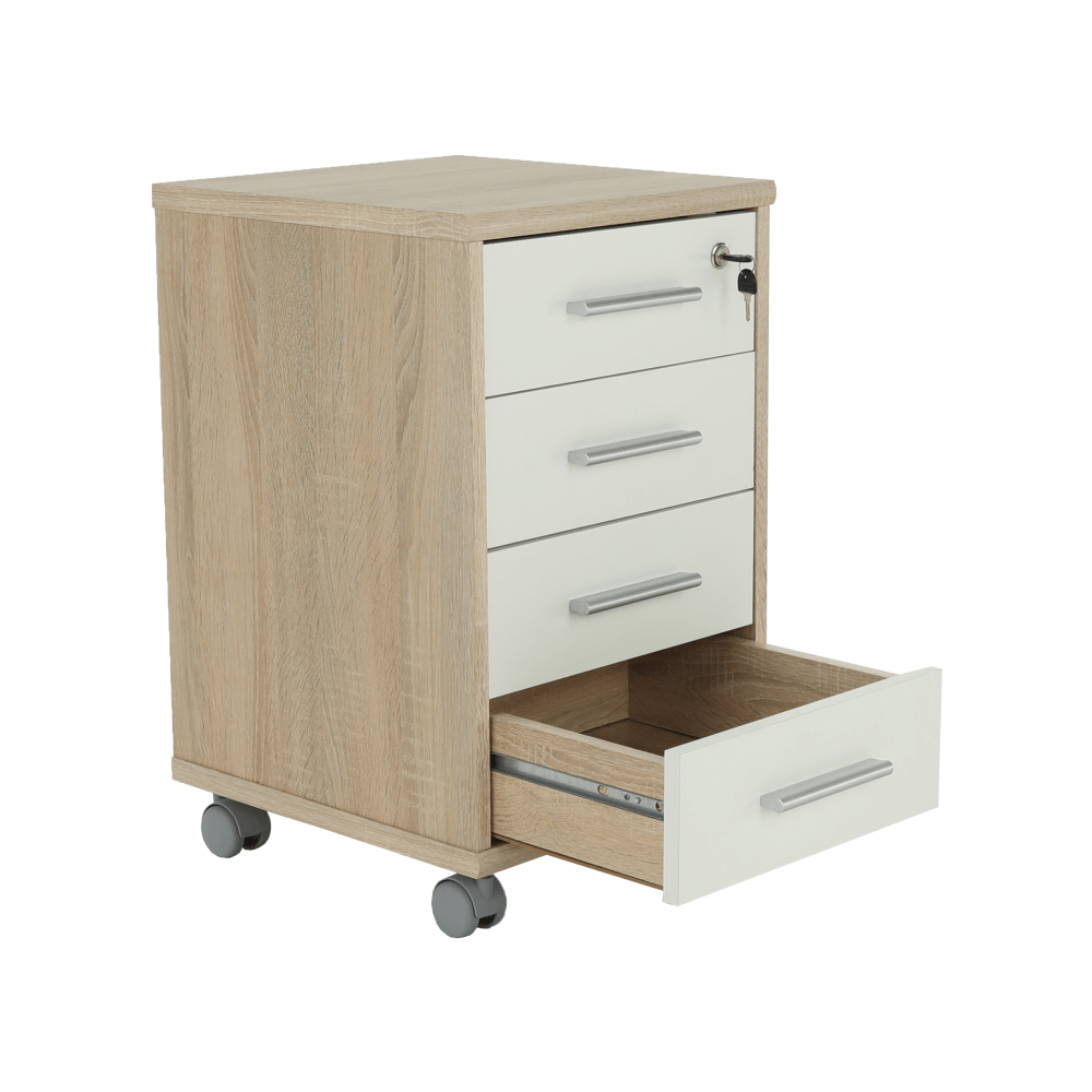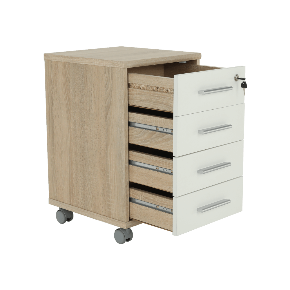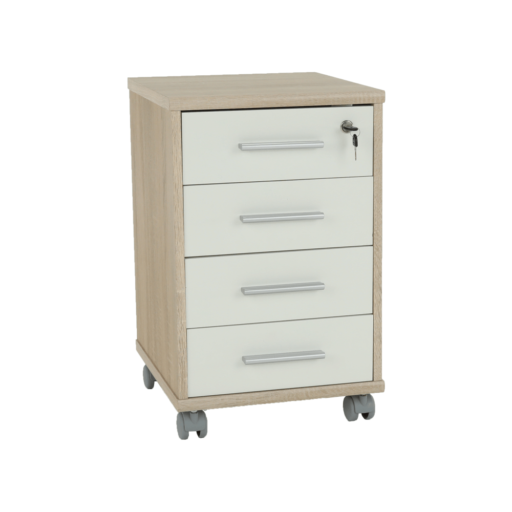 Kancelársky kontajner JOHAN 2 NEW 12 so zámkom a štyrmi šuplíkmiZámok je len pre hornú zásuvku, zvyšné zásuvky sa nedajú uzamknúť.farebné prevedenie: dub sonoma/biela, materiál: DTD lamiovaná/ABS hranyRozmery (ŠxHxV): 39x40,5x61,5 cm Hrúbka materiálu: 16/22 mm Slovenský výrobokDodávané v demonte