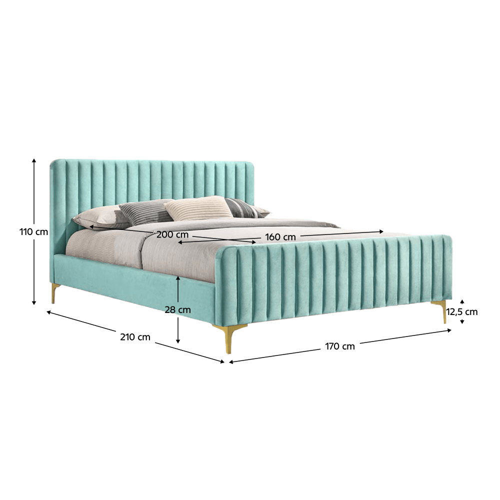 Materiál čalúnenia: Velvet látkaOderuodolnosť textílie podľa testu Martindale: 80 000 oderovFarba čalúnenia: neo mintMateriál nohy: kov chrómFarba nohy: gold zlatý matnýRozmery (ŠxHxV): 170x210x110 cmPlocha na spanie (ŠxH): 160x200 cmVýška po rošt : 28 cmDodávané s lamelovým roštomNosnosť na jedno lôžko: 110 kgKovové nohyDekoratívne prešívané čeláDodávané bez matracaMožnosť zakúpiť matrace z našej ponukyK posteli je potrebné zakúpiť matrac min. s výškou 20 cmDodávané v demonte