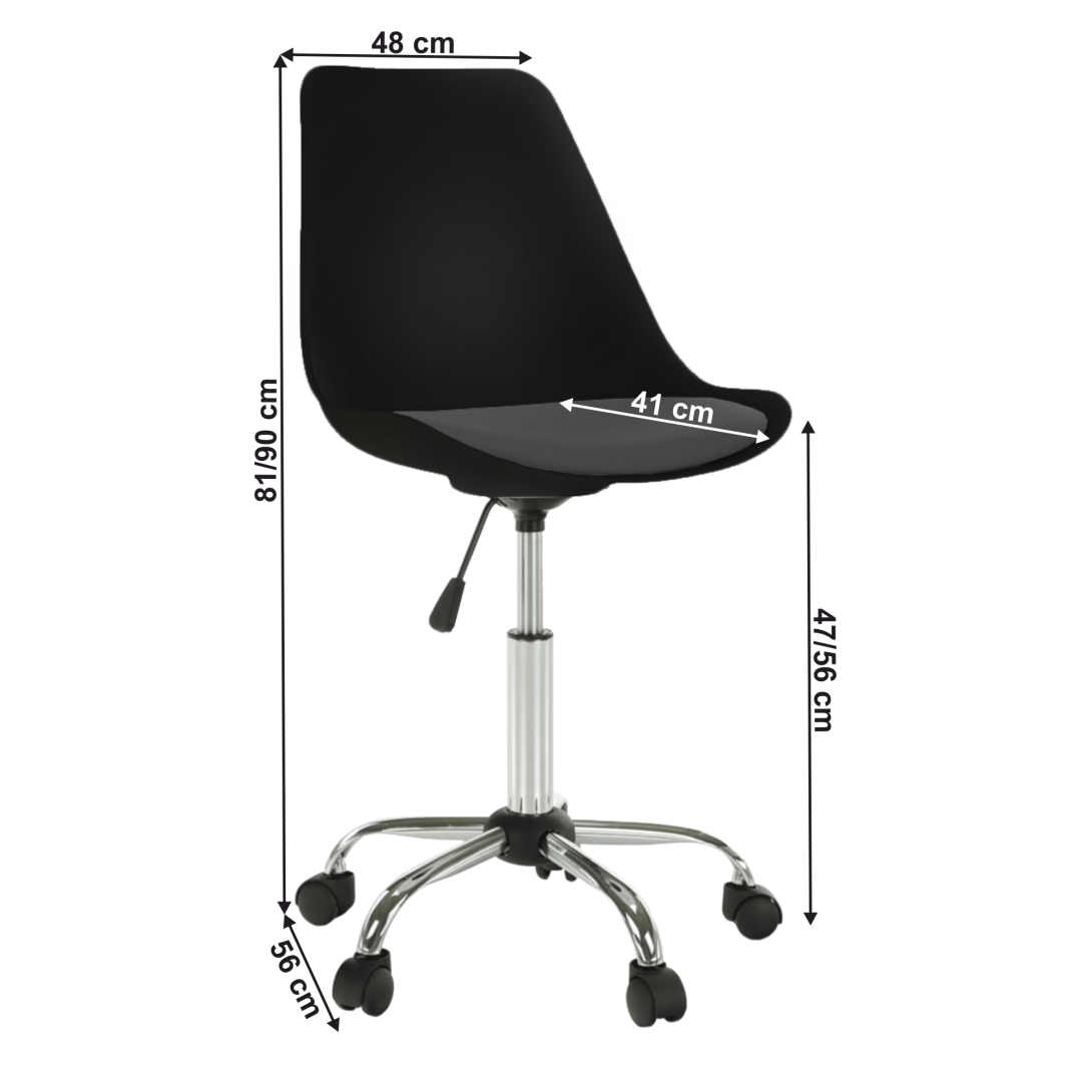 Materiál: plast/ekokoža/chrómOderuodolnosť textílie podľa testu Martindale: 100 000 oderovFarba: čierna/tmavosivá/chrómovanáRozmery (ŠxHxV): 48x56x81-90 cmNastaviteľná výška seduVýška sedu: 47-56 cmHĺbka sedu: 41 cmNosnosť: 100 kgErgonomický tvar sedadlaNa kolieskachDodávané v demonte