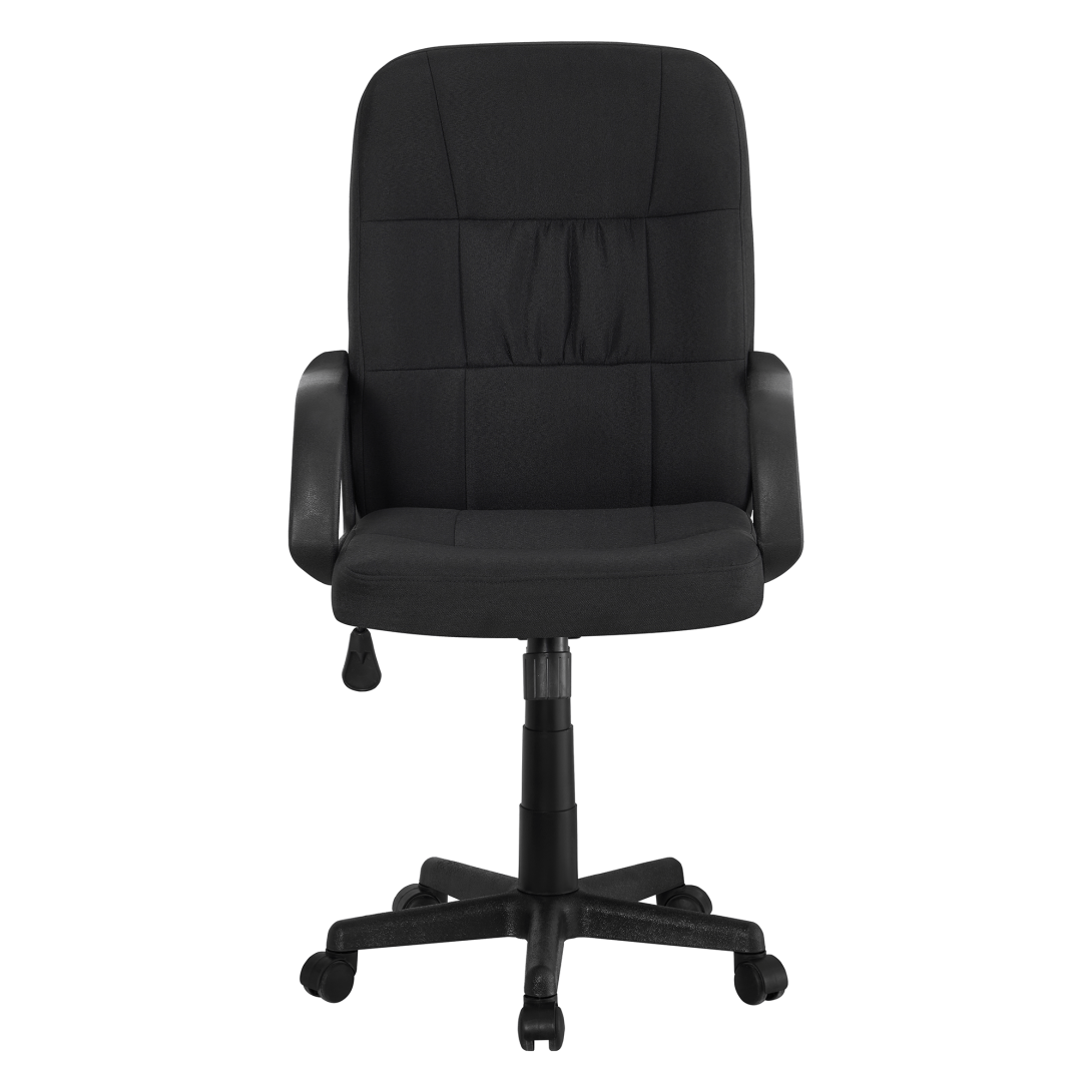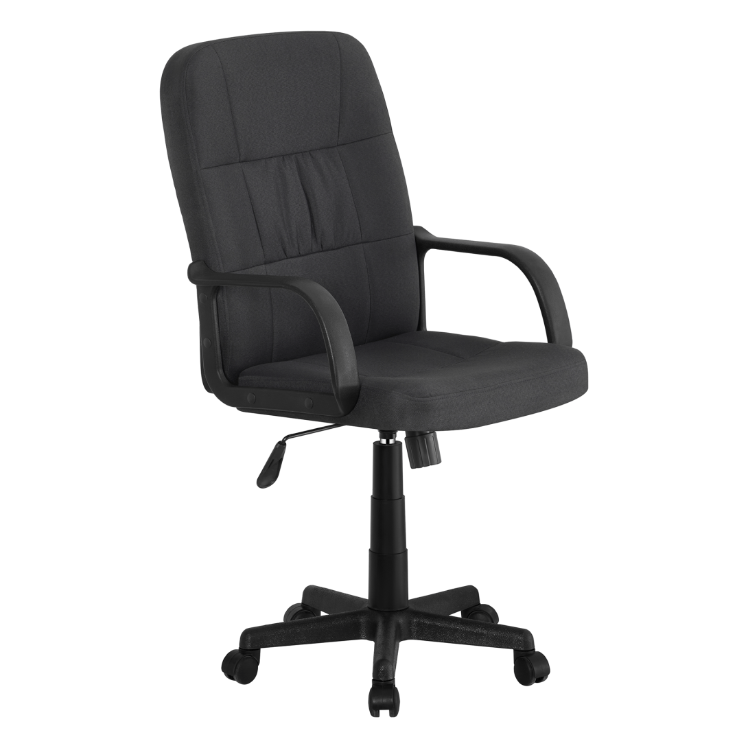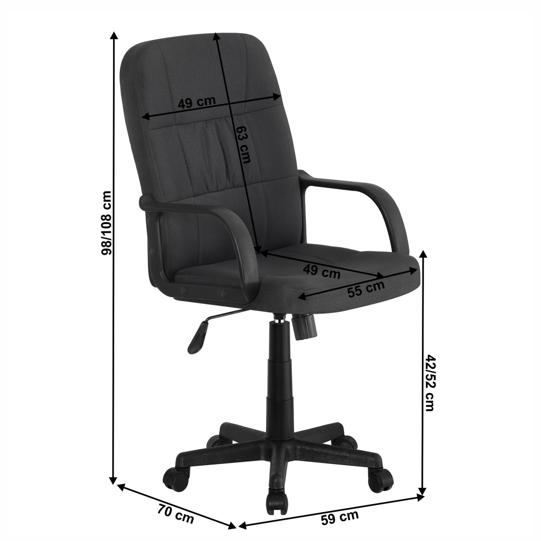 Kancelárske kreslo KERETMateriál: látka/plastOderuodolnosť textílie podľa testu Martindale: 60 000 oderovFarba: čiernaRozmery (ŠxHxV): 59x70x98-108 cmNastaviteľná výška sedu: 42-52 cmHĺbka sedu: 49 cmNosnosť: 110 kgOpierka chrbta (ŠxV): 49x63 cmSedadlo (ŠxH): 55x49 cmNastavenie výšky seduMechanizmus hojdaniaPlastové opierky na ruky aj spodná ružicaDodávané v demonte