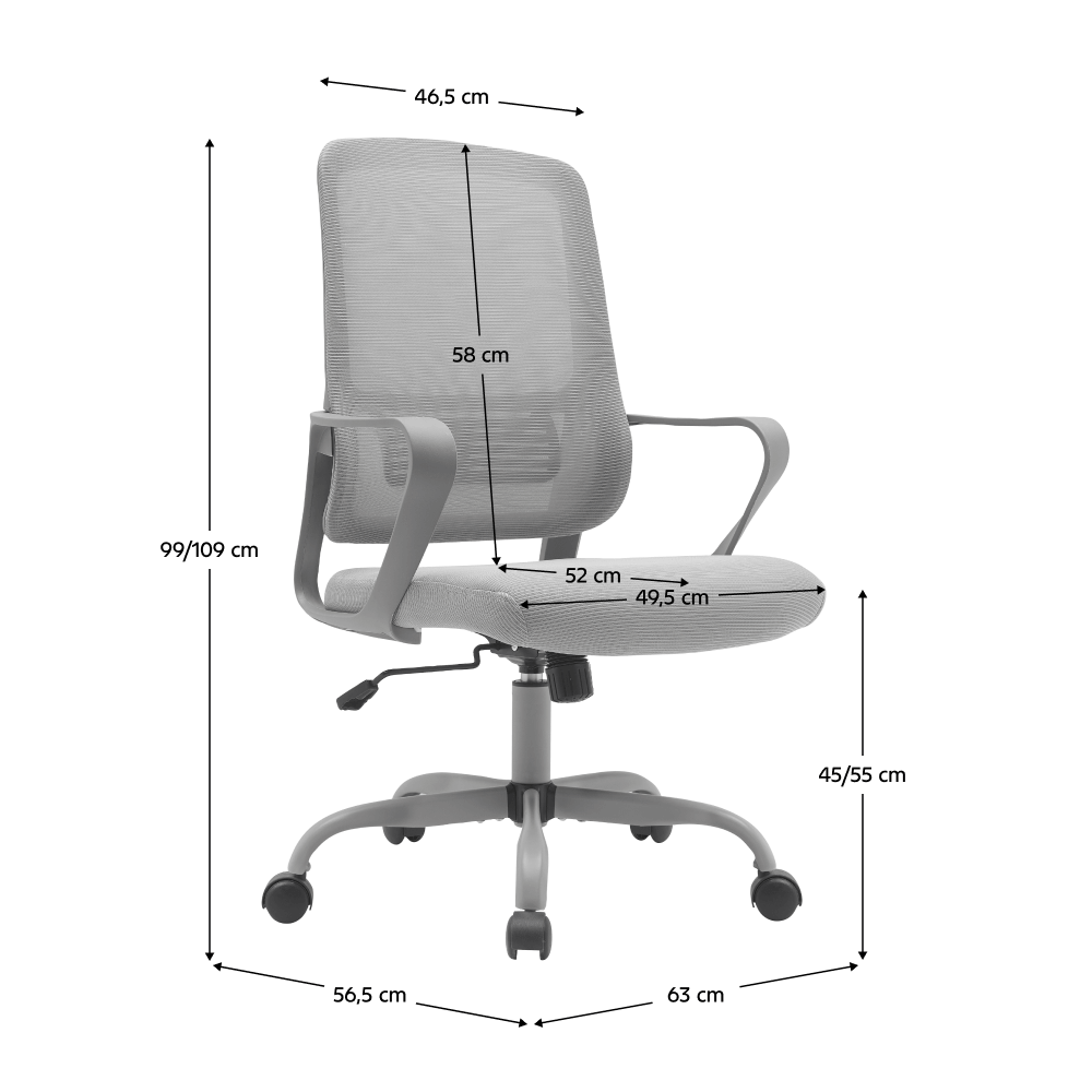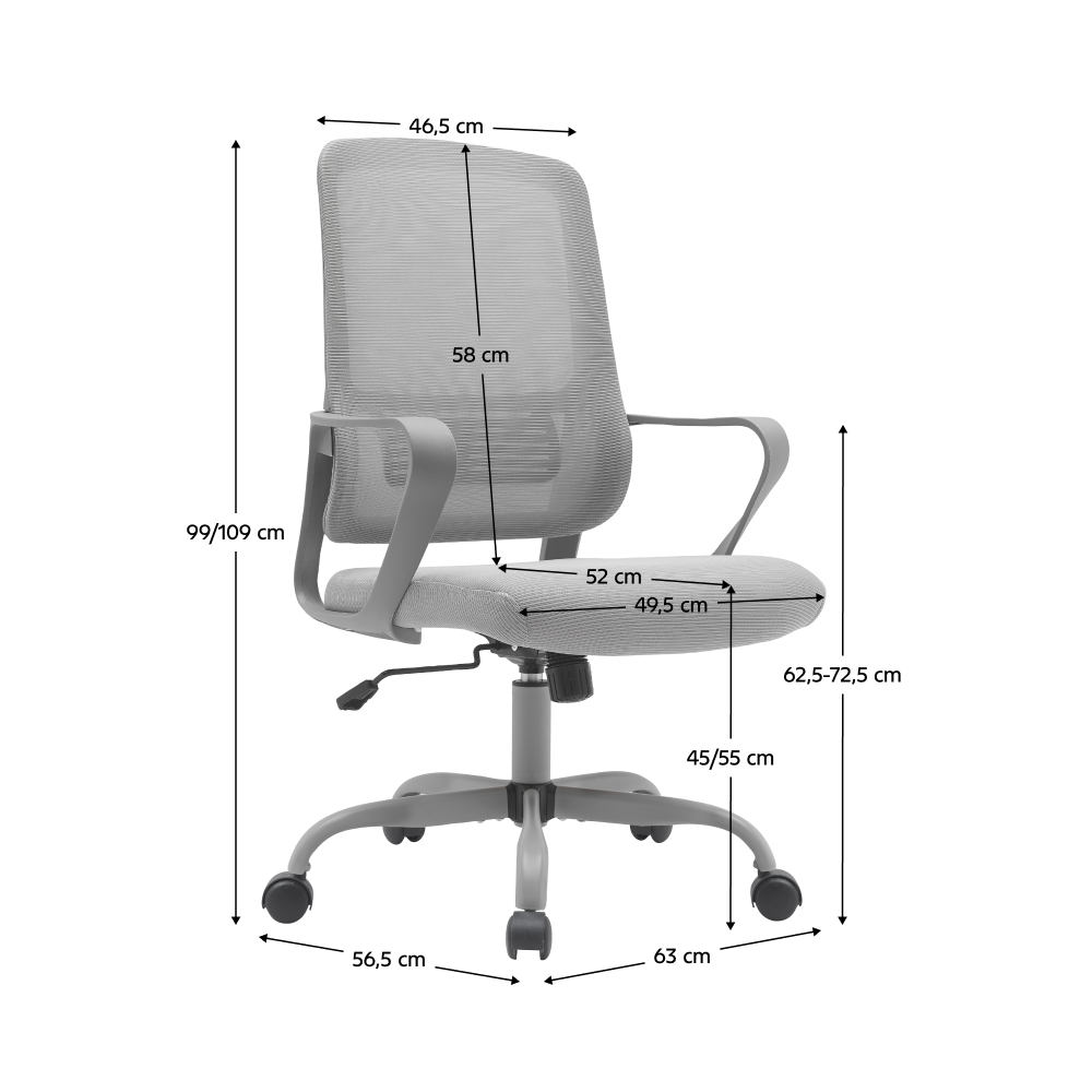 Materiál: sieťovina/kov/plastOderuodolnosť sieťoviny podľa testu Martindale: 90 000 oderovFarba: siváRozmery (ŠxHxV): 63x56,5x99-109 cmVýška sedu: 45-55 cmHĺbka sedu: 52 cmŠírka sedu: 49,5 cmVýška chrbtovej opierky: 58 cmŠírka chrbtovej opierky: 46,5cmNosnosť: 100 kgMožnosť nastaviť výšku seduPäťramenná kovová podstavaUniverzálne kolieskaVhodné na tvrdé aj mäkké podlahyMechanizmus hojdaniaDodávané v demonte