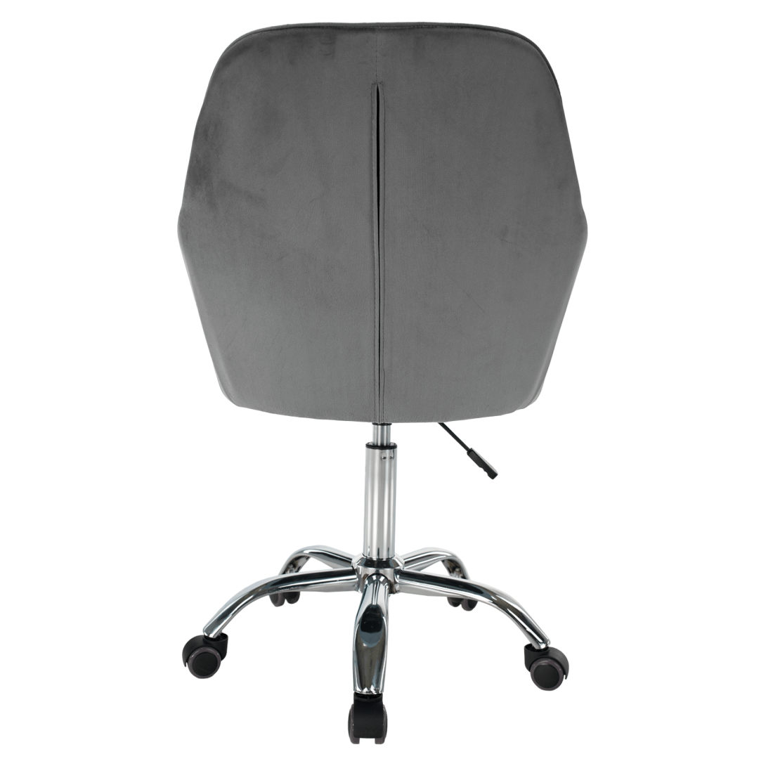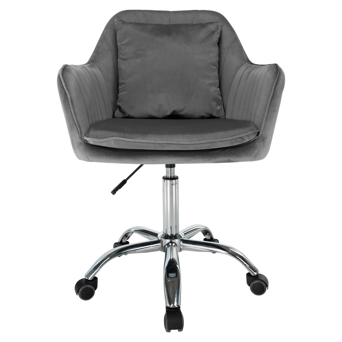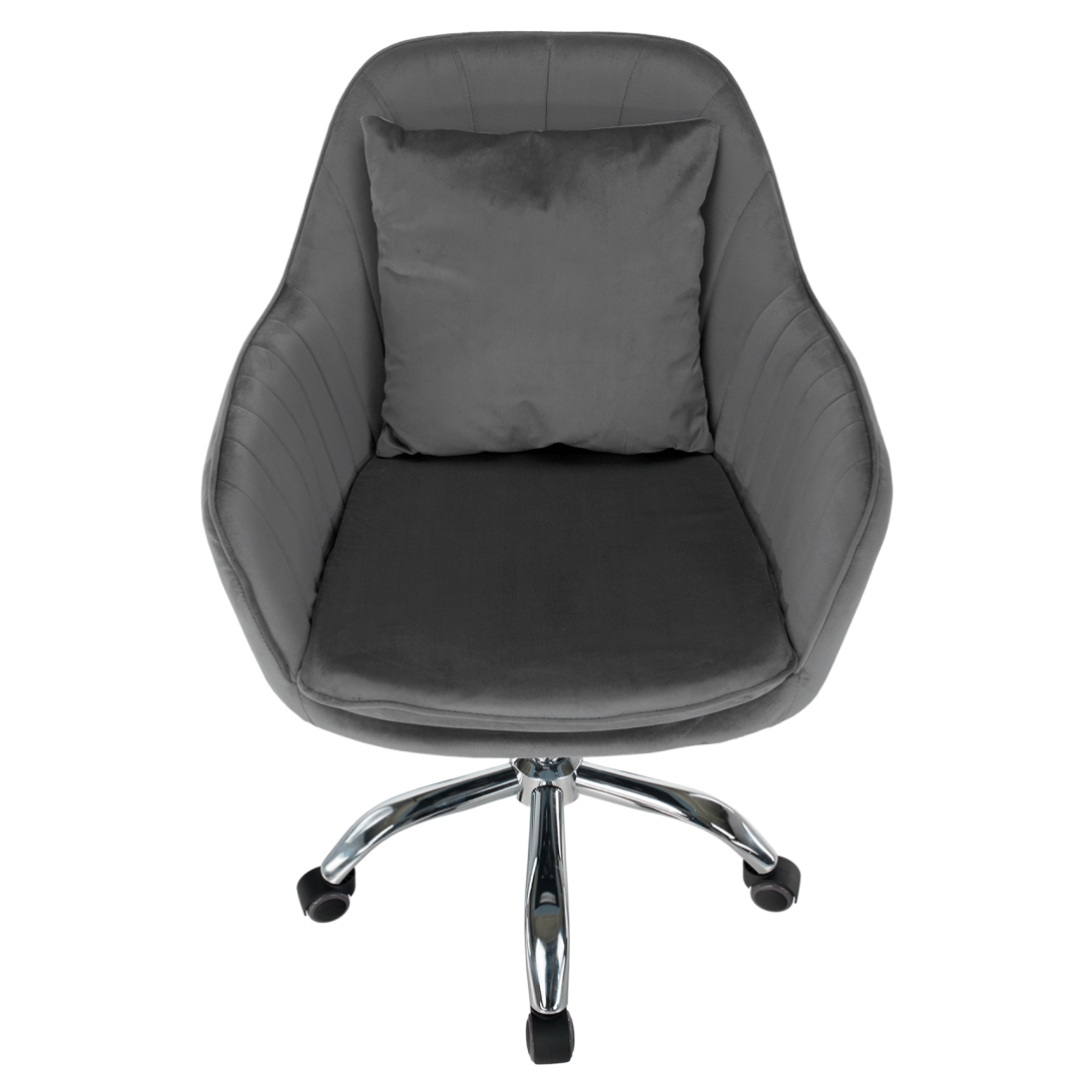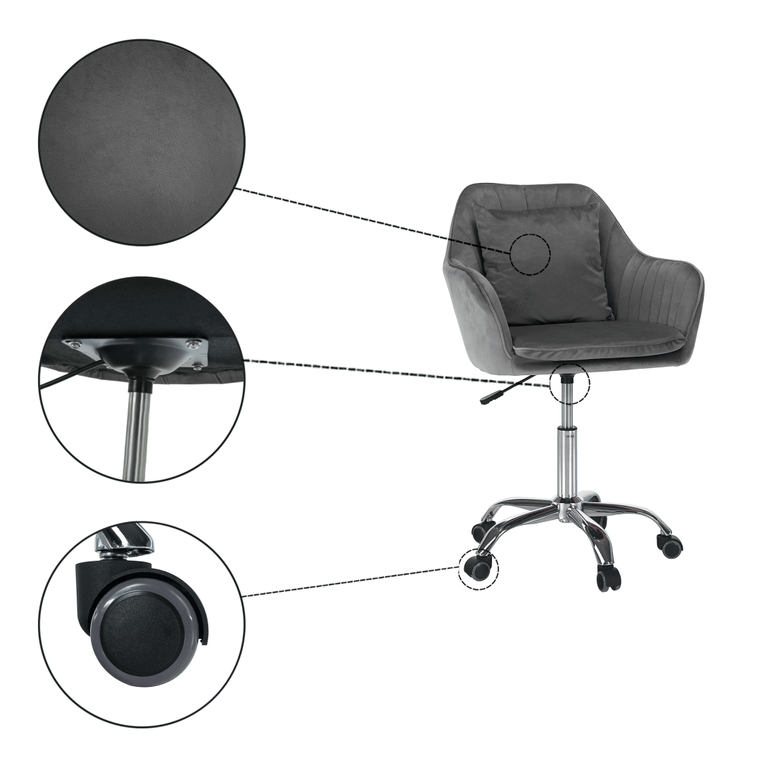 Kancelárske kreslo KLIANMateriál: látka Velvet/chrómOderuodolnosť textílie podľa testu Martindale: 85 000 oderovFarba: sivá/chrómRozmery (ŠxHxV): 59x61x87/101 cmŠírka sedu: 42 cmVýška opierky na ruku: 18 cmRozmery vankúša (ŠxV): 32x32 cmVýška sedu: 50/65 cmHĺbka sedu: 48 cmOpierka chrbta (ŠxV): 48x41 cmNosnosť: 100 kgS vankúšomNastaviteľná výška seduOtáčavéUniverzálne kolieska sú vhodné na mäkké aj tvrdé podlahyDodávané v demonte