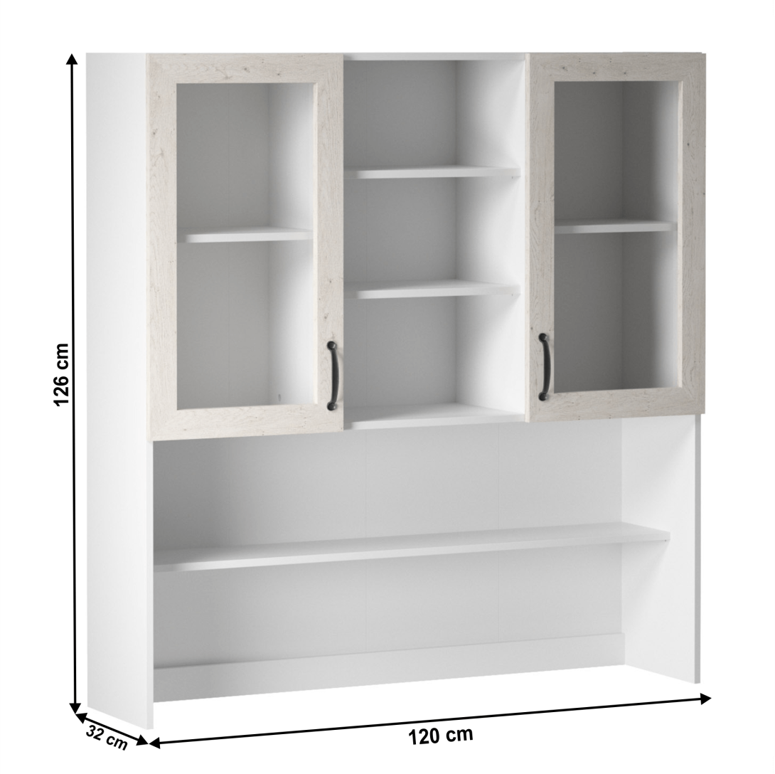 Kombinovaný nadstavec so skrinkami, otvoreným úložným priestorom a policou, ROYAL K120Materiál: korpus je vyrobený z kvalitnej laminovanej drevotriesky/kovová úchytka/skloFarba: biela/dvierka v prevedení sosna nordickáRozmery ŠxHxV: 120x32x126 cm Hrúbka materiálu: 15 mmSystém tichého zatvárania dvierokDodávané v demonte.Spodné skrinky ku kuchyni ROYAL sú dodávané bez pracovnej dosky a bez sokla. Pracovnú dosku Dub Porterhouse tmavý možné doobjednať v hrúbke 3,8 cm v cene 59 Eur/1 bm. Ku každej dolnej skrinke, okrem rohových skriniek D25PZ, je potrebné doobjednať aj sokel v prevedení dub divoký v cene 10 ur/1 bm a 2 kusy úchytov na sokel v cene 1 Eur/2 ks. Objednávku vpíšte do poznámky v objednávkovom formulári.