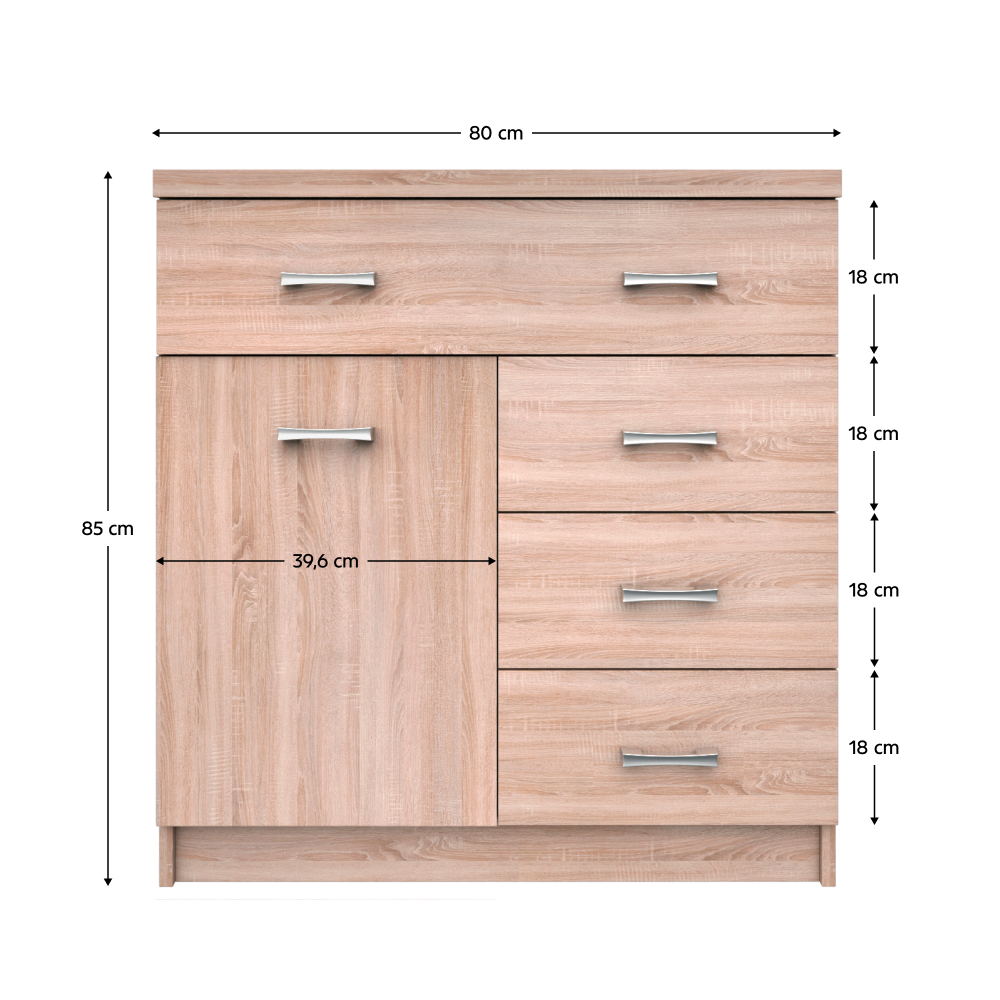 Komoda 1D4S TOPTY TYP 20Materiál: DTD laminovanáFarba: dub sonomaRozmery (ŠxHxV): 80x33x85 cmJednodverová4 šuplíkyDodávané v demonte.