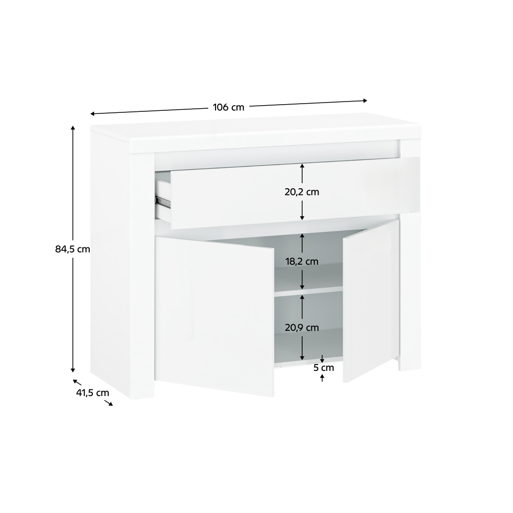 Materiál: laminovaná DTD/MDF/ABS hranyFarba: biely leskRozmery (ŠxHxV): 106x41,5x84,5 cmHrúbka materiálu: 1,6 cmObsahuje jednu zásuvku a skrinku1 policaDvierka bez úchytiekKorpus z DTDDvierka/fronty z MDFABS hranyModerný dizajnDodávané v demonte