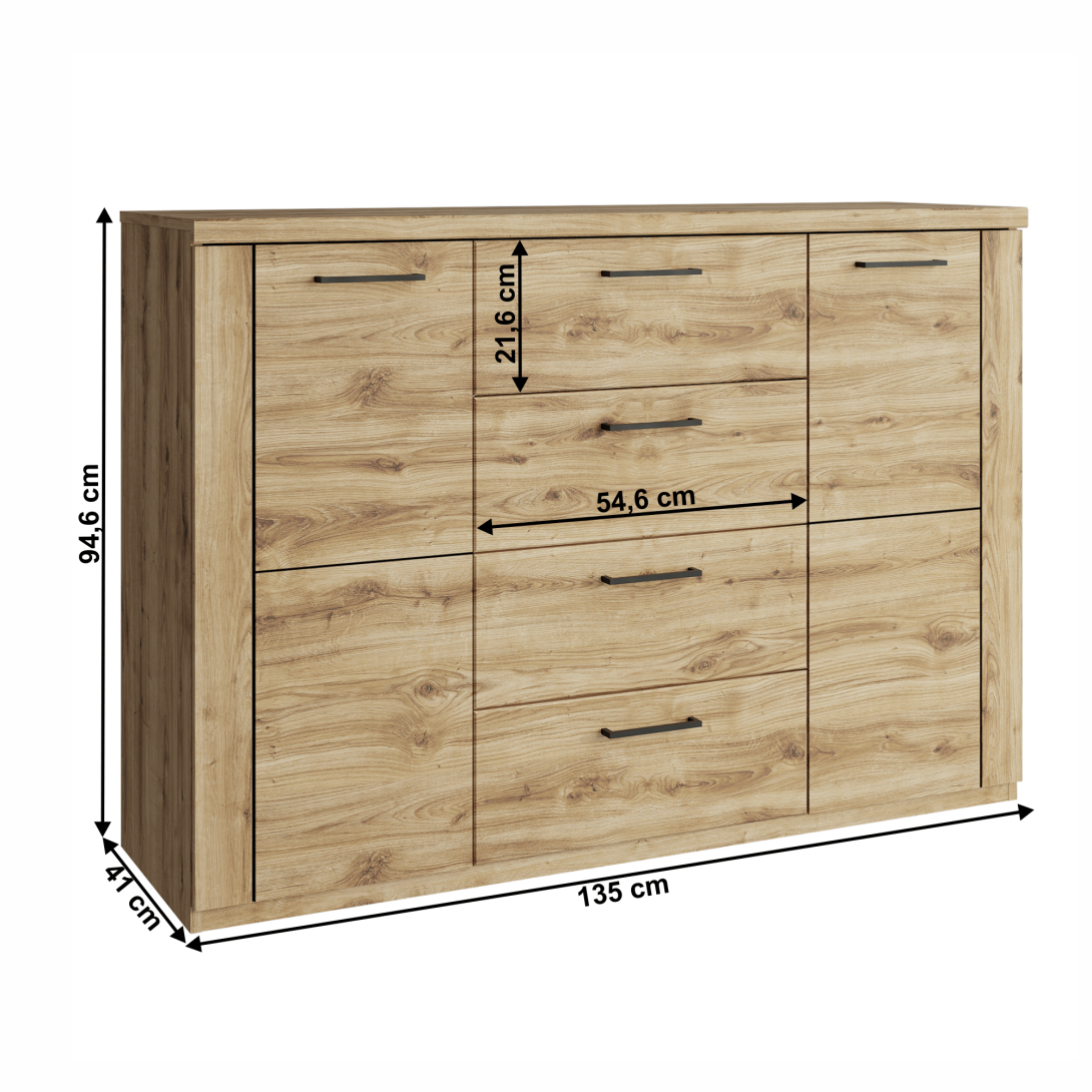 Komoda DORSI 2D4SMateriál: DTD laminovaná/MDFFarba: dub navarraRozmery (ŠxHxV): 135x41x 94,6 cmHrúbka materiálu: 1,6 cmDvojdverováPolicováŠtyri šuplíkyRozmer šuplíka (ŠxV): 54,6x21,6 cmPlastové úchytkyFarba úchytiek: čiernaModerný dizajnDodávané v demonte