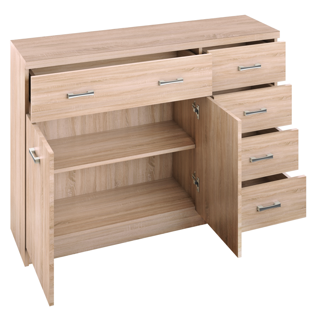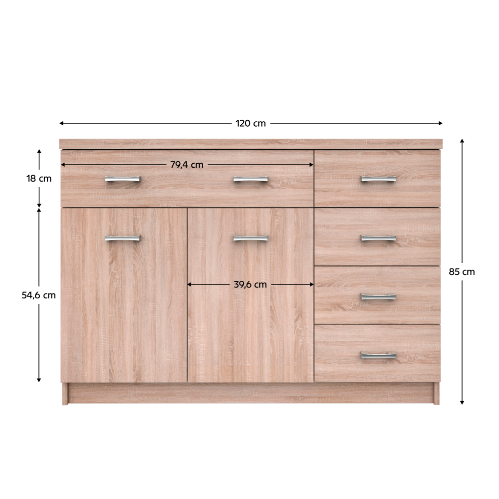 Komoda 2D5S TOPTY TYP 22Materiál: DTD laminovanáFarba: dub sonomaRozmery (ŠxHxV): 120x33x85 cmRozmery šuplíka (ŠxV): 79,4x18 cmŠtyri rovnako veľké šuplíkyVeľký šuplíkDvojdverováRozmery dvierok (ŠxV): 39,6x54,6 cmPolicováDodávané v demonte.