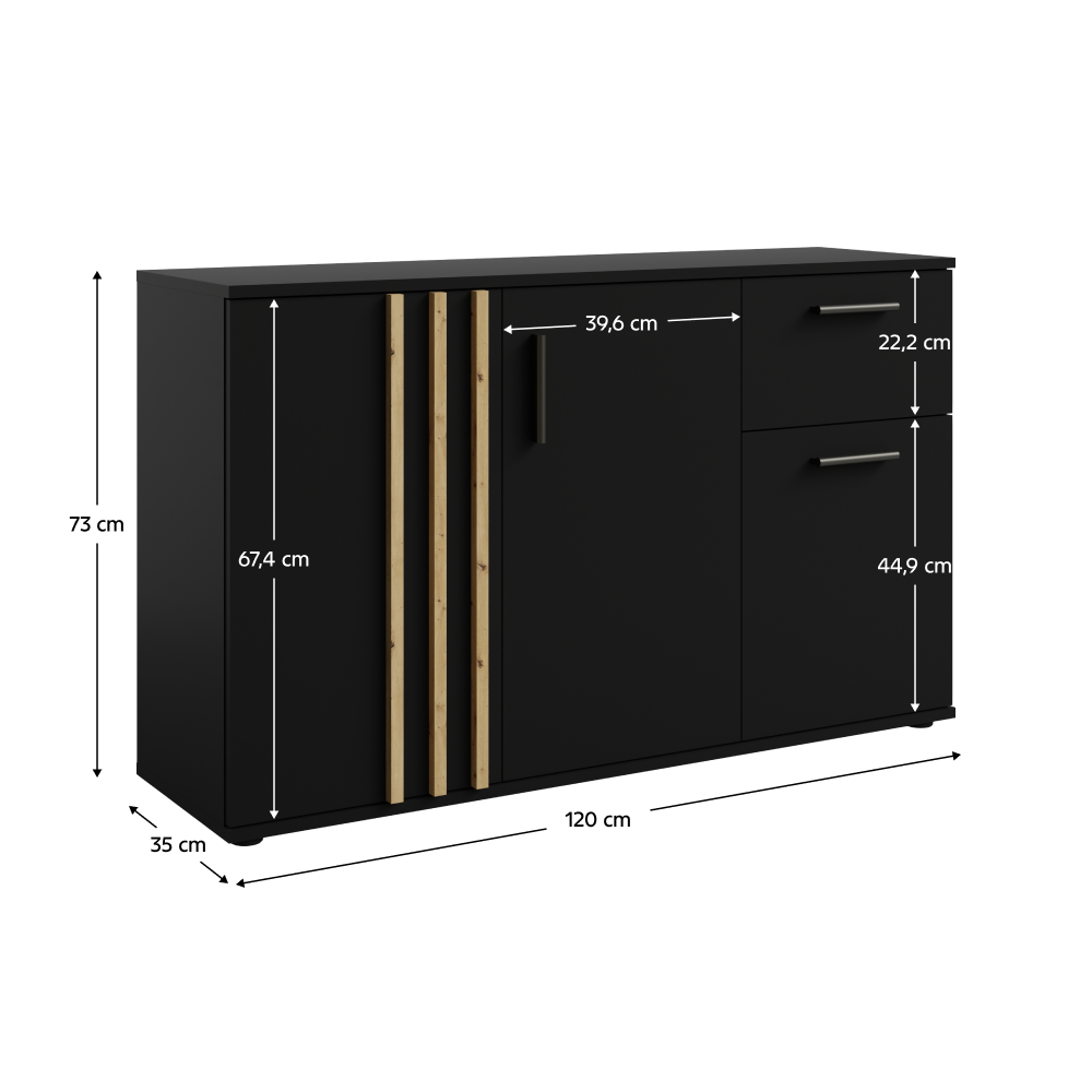 Materiál: DTD laminovaná/MDFFarba: čierna/dub artisanRozmery (ŠxHxV): 120x35x73 cmHrúbka materiálu: 1,6 cmHrúbka lamely: 1,6 cmŠírka lamely: 1,8 cmDvojdverováS policouNosnosť police: 5 kgNosnosť odkladacej plochy: 10 kgÚchytka len na jednej strane dveríMateriál úchytky: MDFFarba úchytky: čiernaDodávané s ozdobnými lamelamiModerný štýlDodávané v demonte
