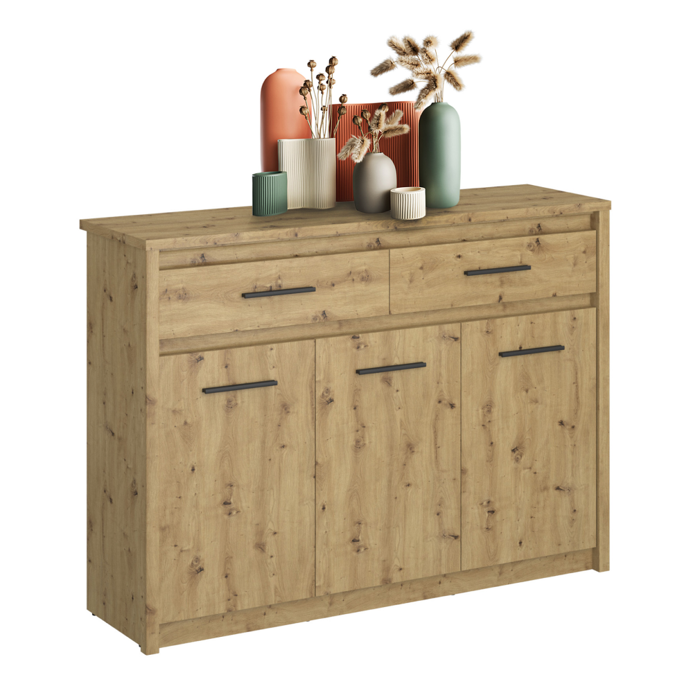 Materiál: DTD laminovaná/ABS hranyFarba: dub artisanRozmery (ŠxHxV): 125,4x36,2x91,2 cmHrúbka materiálu: 1,6-3,2 cmPlastové úchytkyFarba úchytiek: čiernaTrojdverováDva šuplíkyNosnosť šuplíka: 5 kgVýška šuplíka: 15,1 cmPlastové nožičkyModerný dizajnOdporúčame pripevniť k steneDodávané v demonte