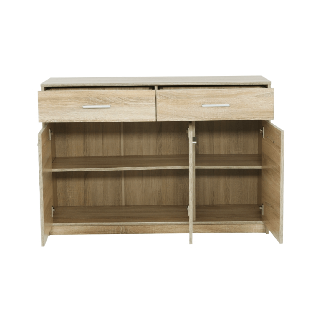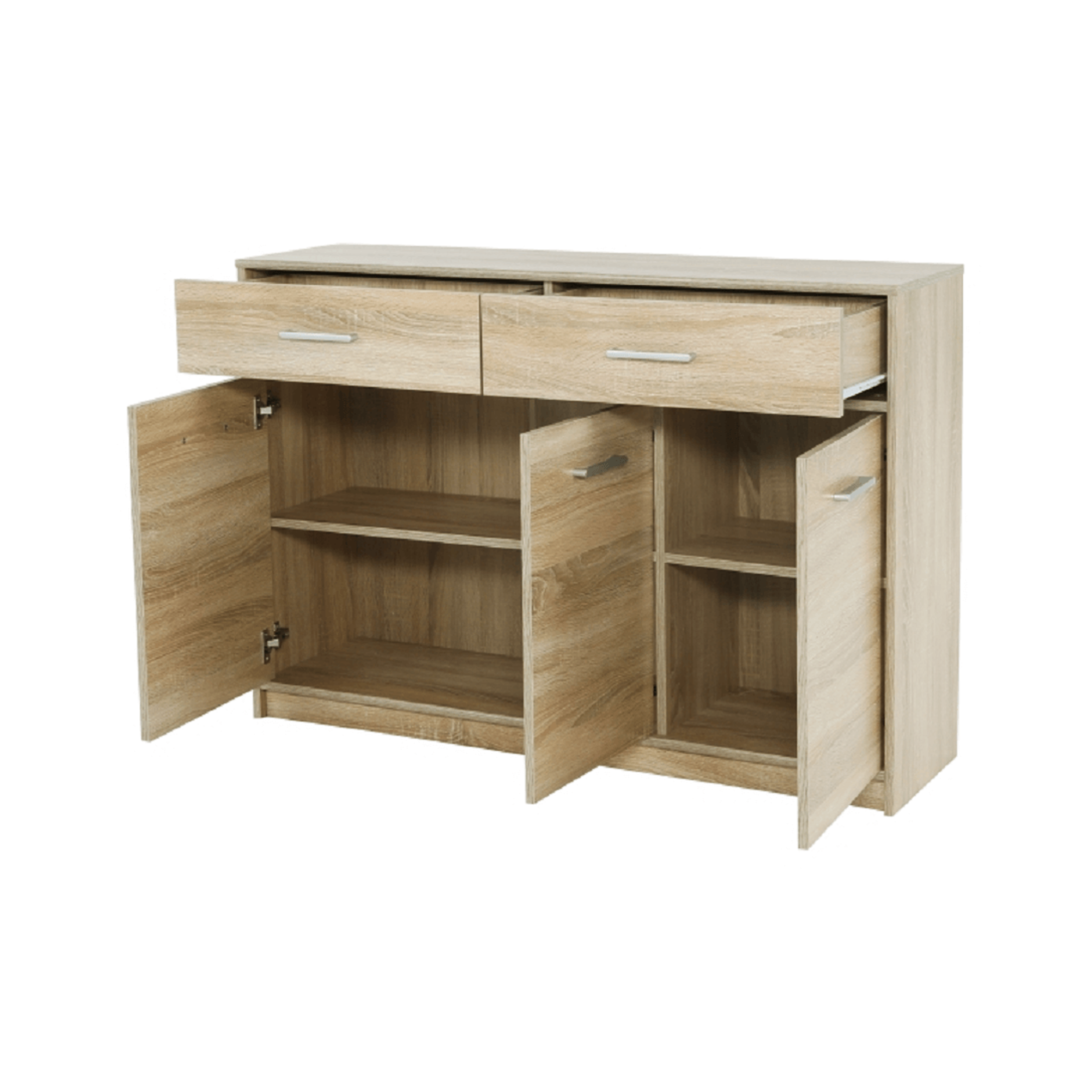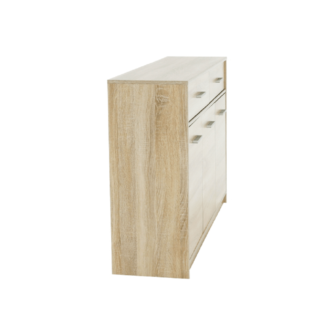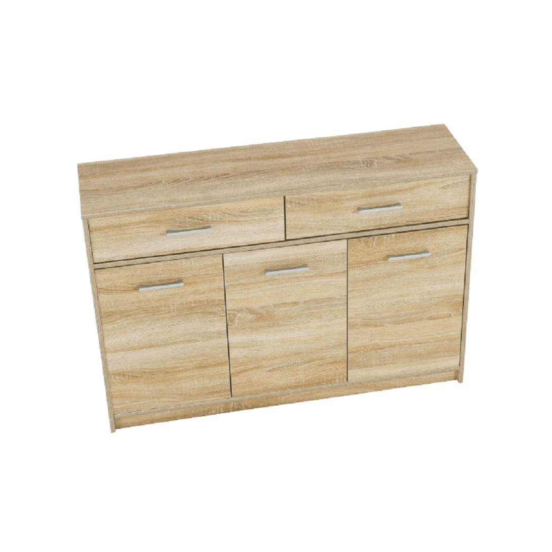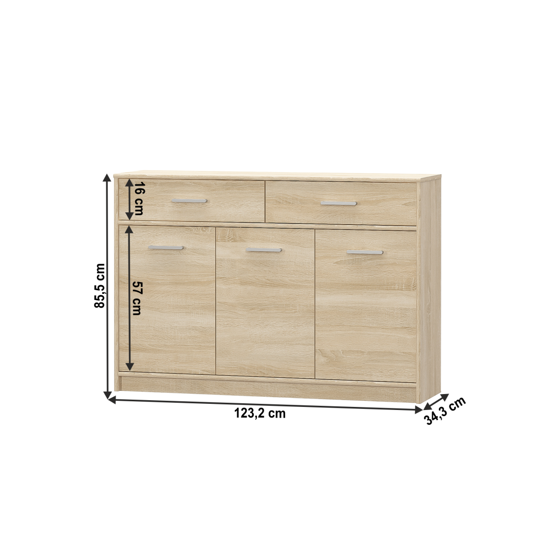 Komoda 3D2S TEYOMateriál : DTD laminovanáFarebné prevedenie: dub sonomaRozmery (ŠxHxV): 123,2x34,3x85,5 cmHrúbka materiálu: 16 mm Dodávaná v demonte.