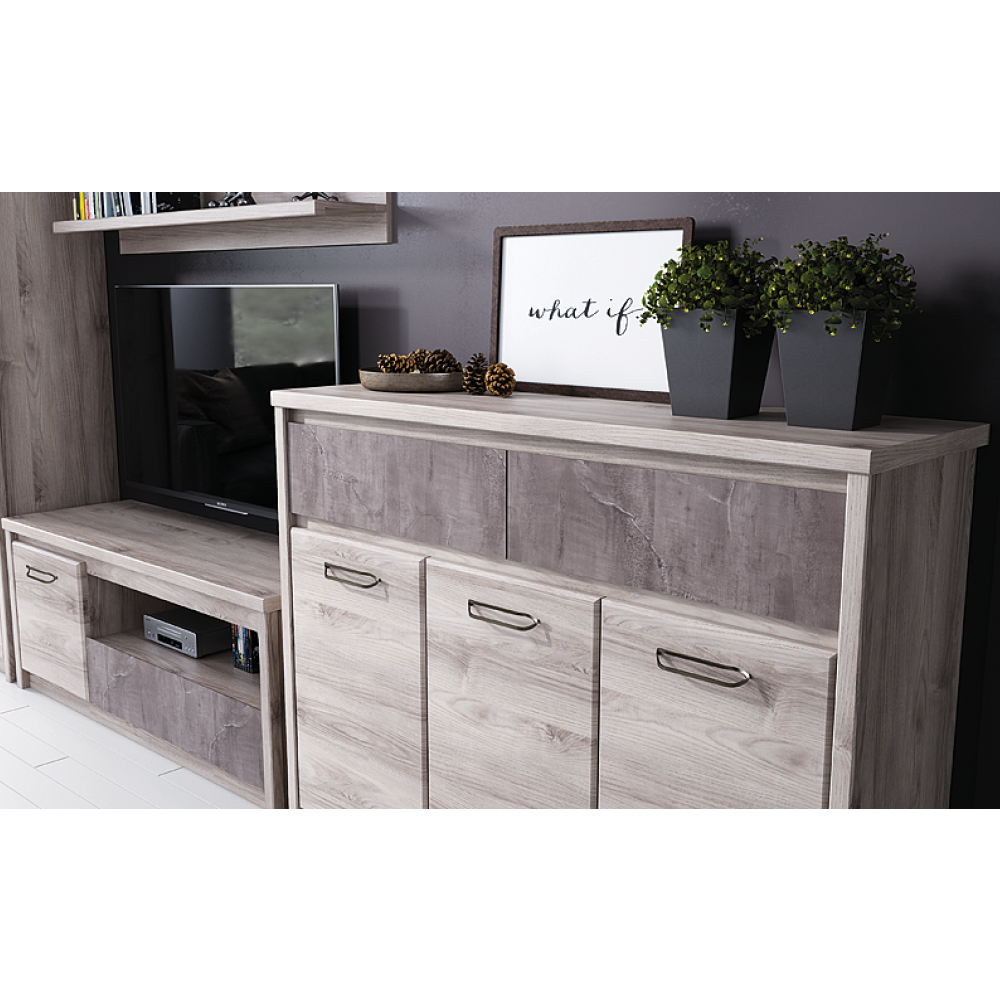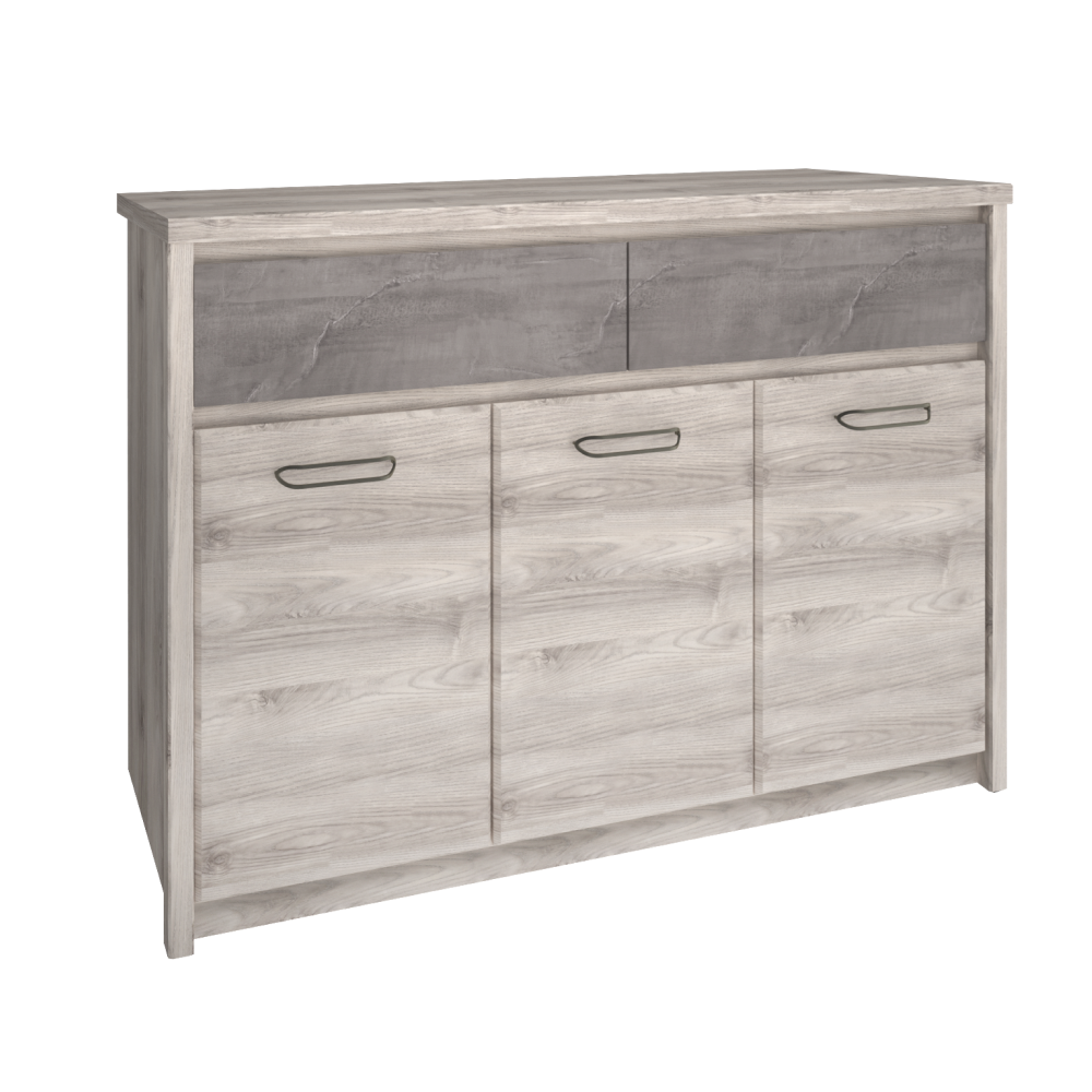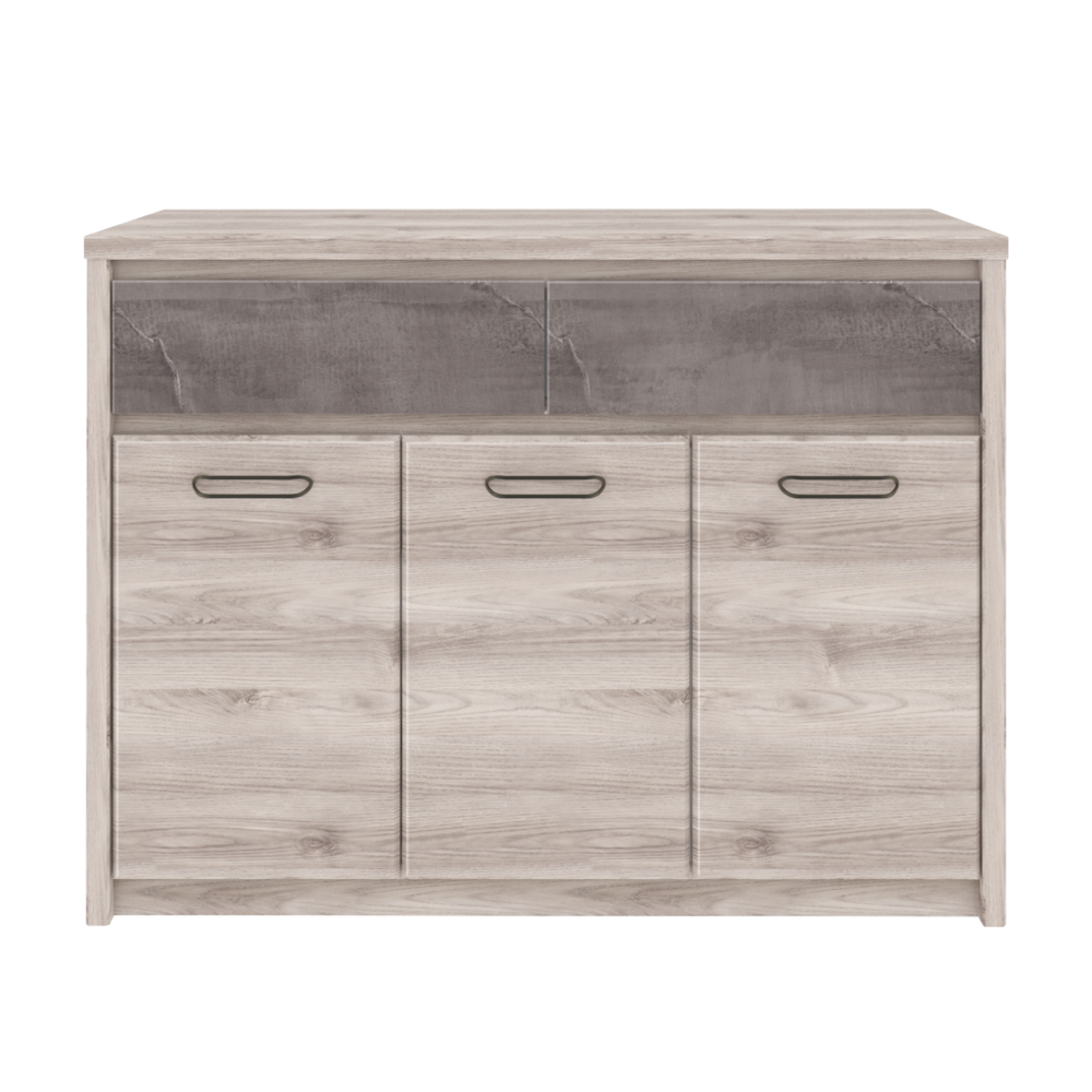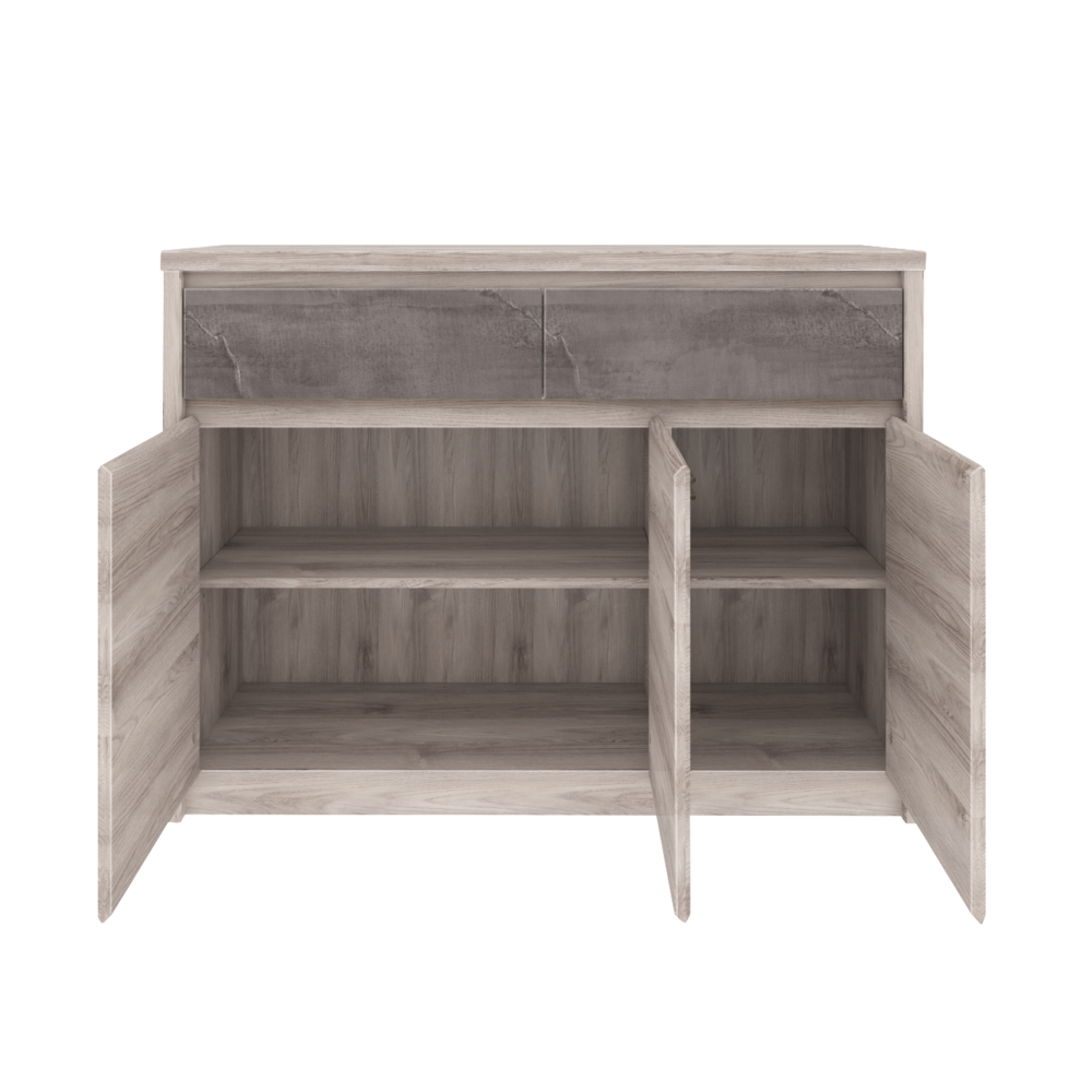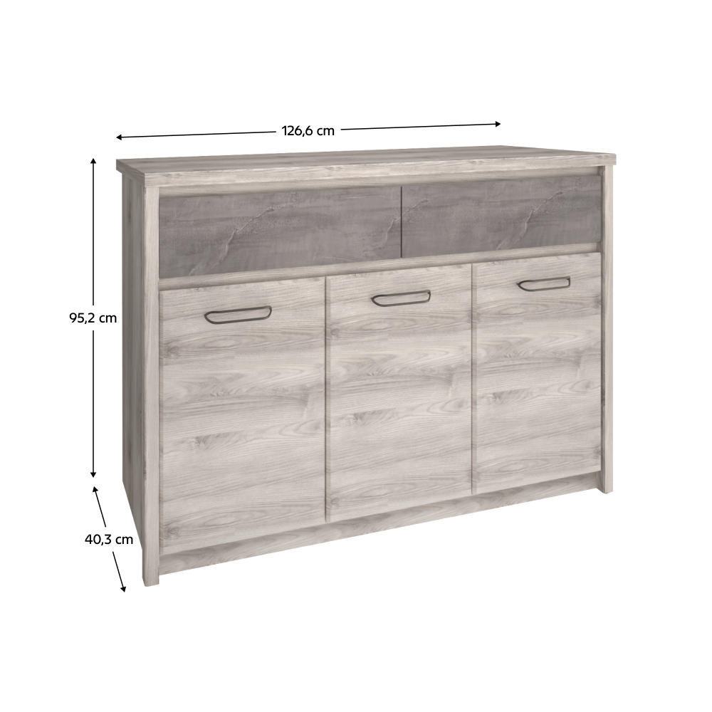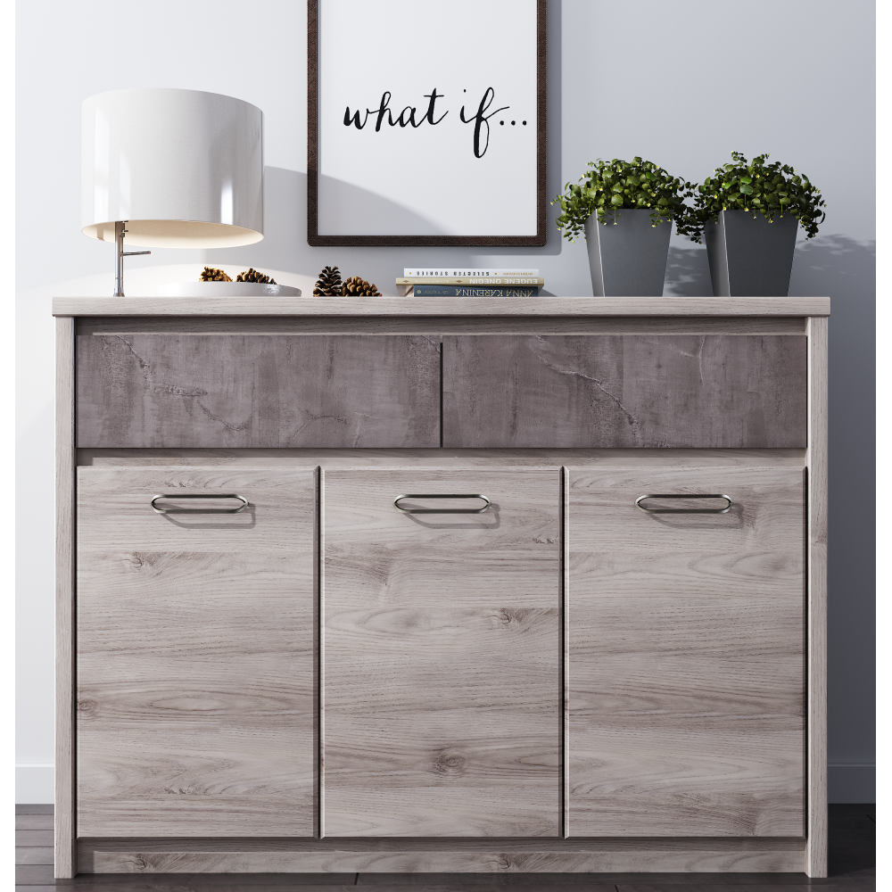 Materiál: DTD laminovanáFarba: gaštan nairobi/onyxRozmery (ŠxHxV): 126,6x95,2x40,3 cmHrúbka materiálu: 1,6-3,2 cmPlastové nožičkyKovové úchytkyFarba úchytiek: čiernaTrojdverováDva šuplíkyNosnosť šuplíka: 5 kgModerný dizajnDodávané v demonte