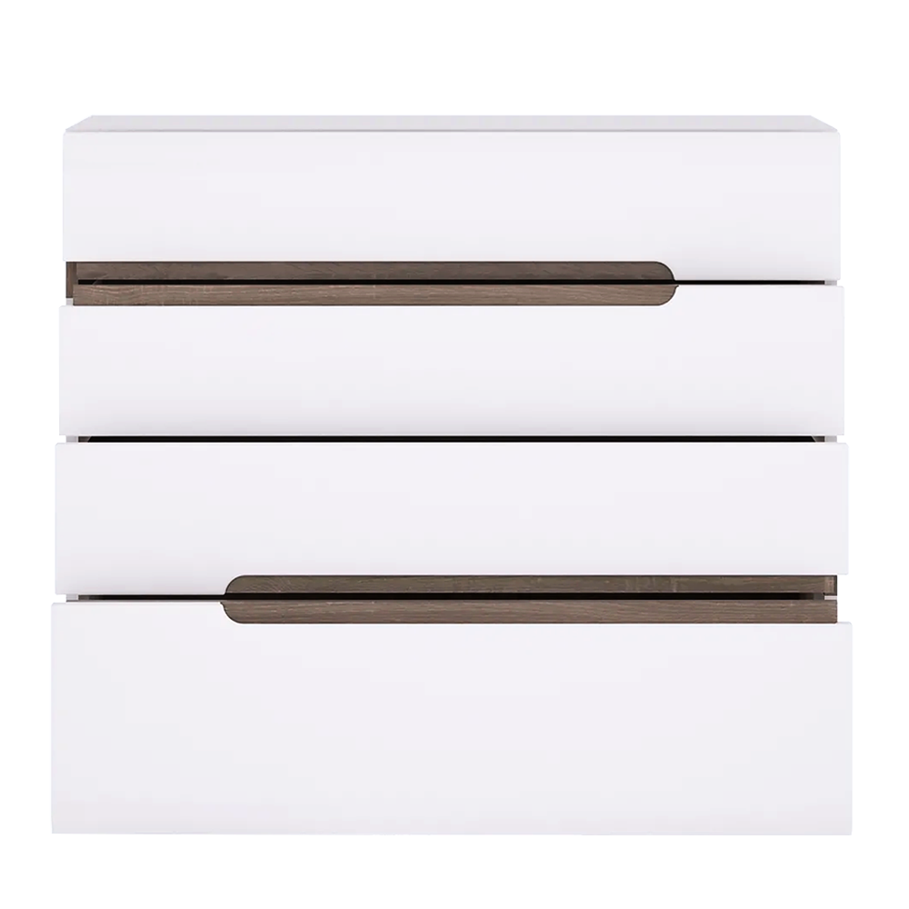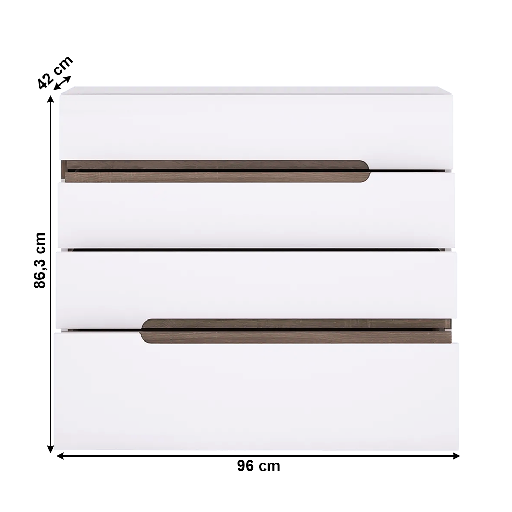 Typ 44, komoda z luxusnej sektorovej zostavy Lynatet, Nemecký dizajn s elegantnými doplnkami v hnedej farbe. Prevedenie: biela + dub sonoma tmavý truflový,Materiál: korpus bielej farby MDF laminovaná, predné časti sú vyrobené z MDF bielej farby - extra vysoký lesk HG,DTD laminovaná odolná voči poškriabaniu, vlhkosti a vysokej teplote. Dvierka majú moderné zaoblené hrany. Rozmery (ŠxHxV): 96x42x86,3 cm.Hrúbka materiálu: 16 mmKorpus je v matnom prevedeníDvierka sú v prevedení extra vysoký leskDodávané v demonte.