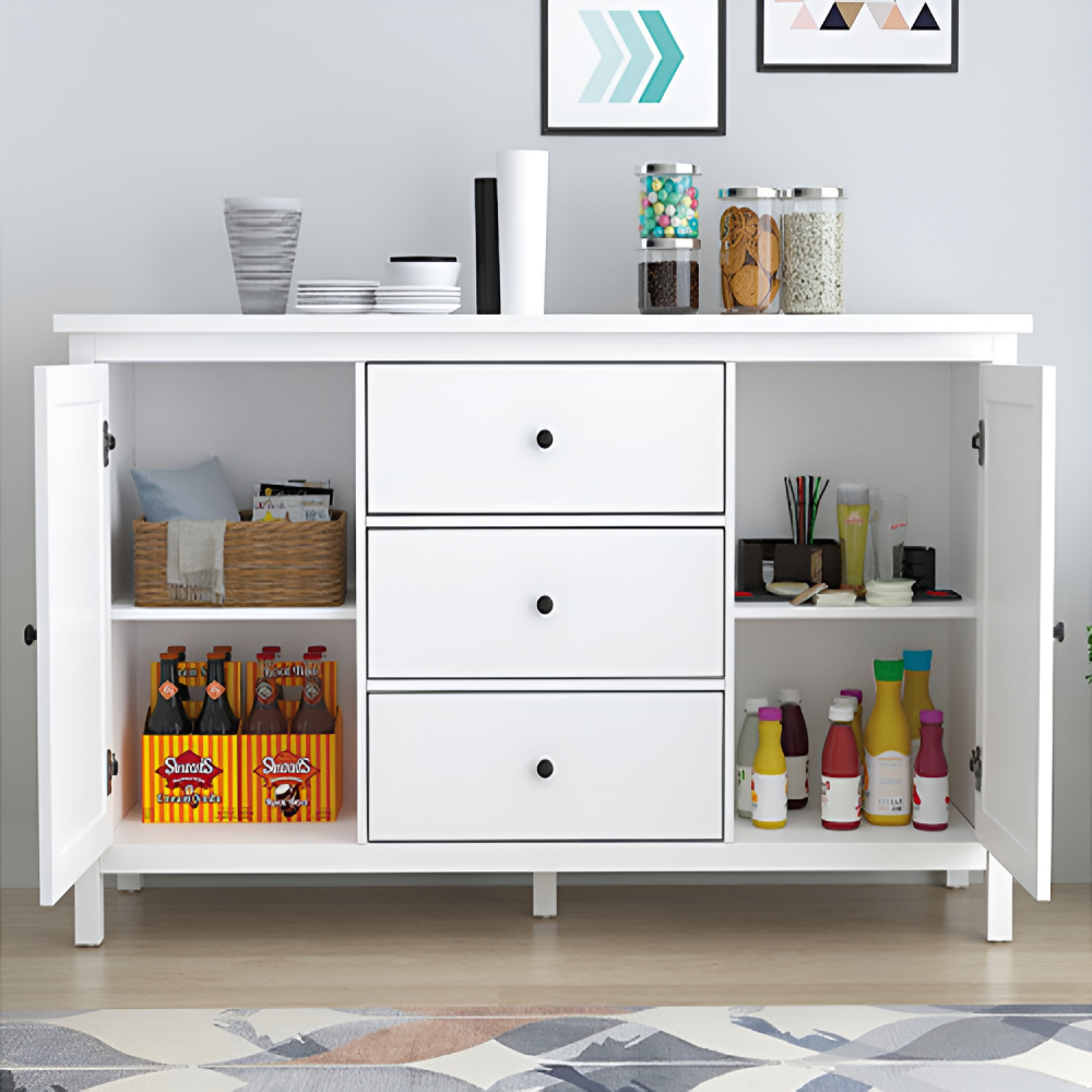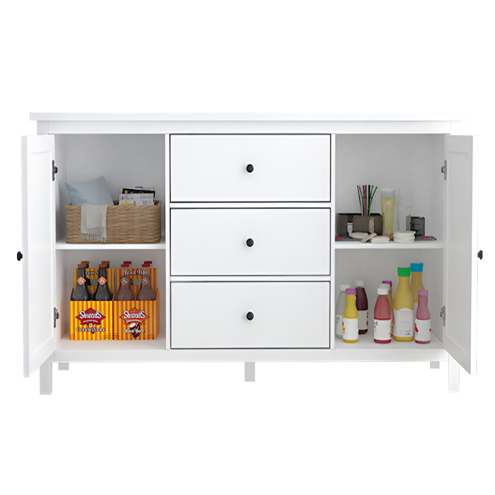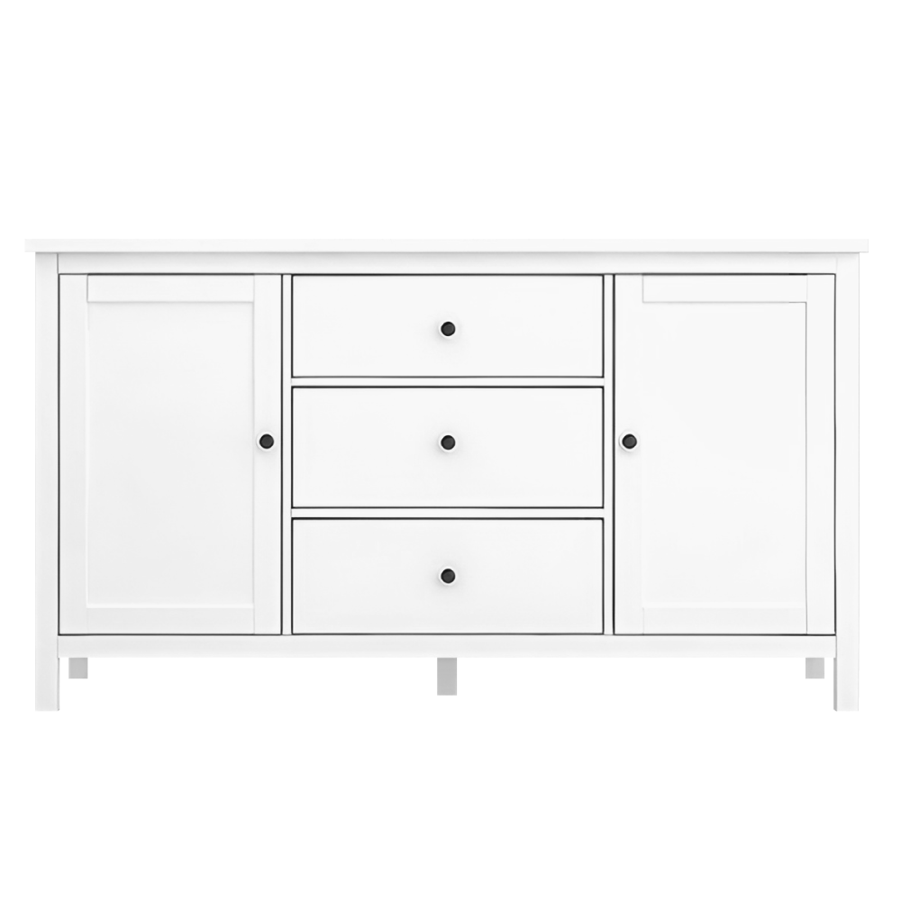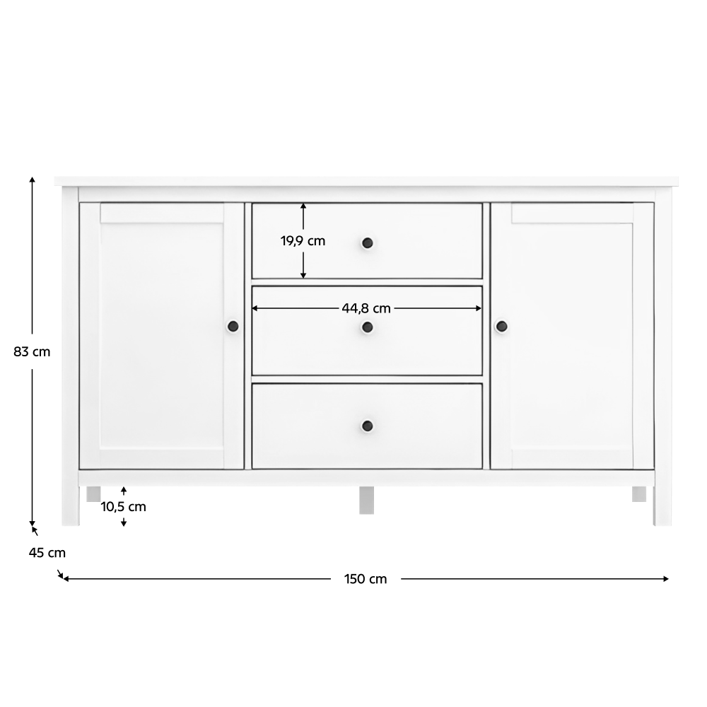 Materiál: MDFFarba: bielaRozmery (ŠxHxV): 150x45x83 cmHrúbka materiálu MDF: 1,5 cmKomodaPríborníkDvojdverováDve skrinkyPoliceŠírka police: 45 cmVýška medzi policami: 31,9 cmTri zásuvkyRozmery zásuvka (ŠxV): 44,8x19,9 cmNa nožičkáchStredová podporná nožičkaVýška spodného priestoru od podlahy: 10,5 cmS úchytkamiMateriál úchytiek: zinokFarba úchytiek: čiernaPraktickáNosnosť vrchnej dosky: 25 kgNosnosť police: 15 kgNosnosť zásuvka: 5 kgOdporúčame pripevniť k steneDodávané v demonte